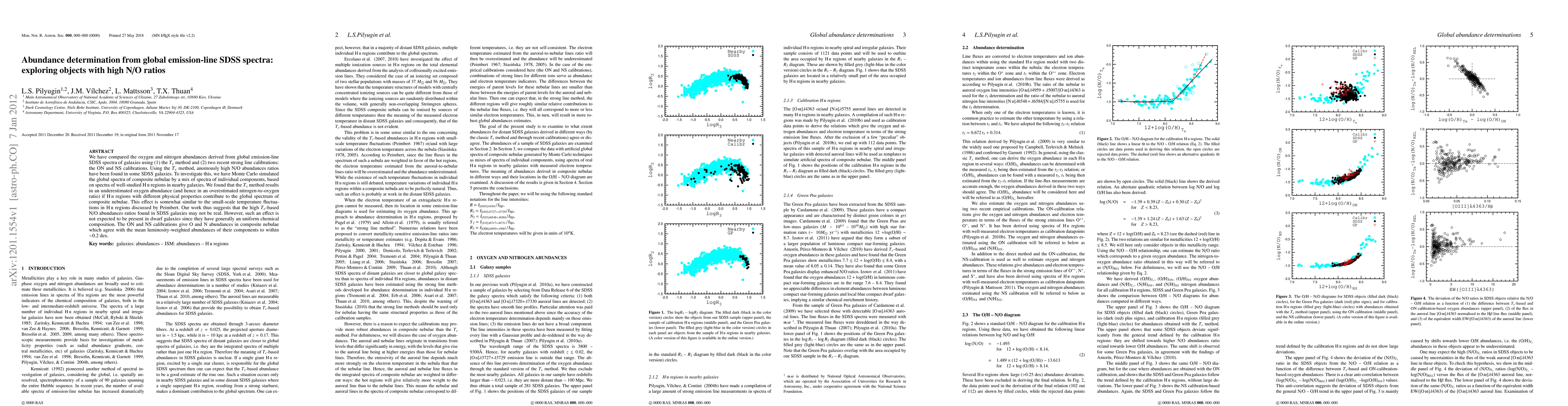 We have compared the oxygen and nitrogen abundances derived from global emission-line SDSS spectra of galaxies using (1) the Te method and (2) two recent strong line calibrations: the ON and NS calibrations. Using the Te method, anomously high N/O abundances ratios have been found in some SDSS galaxies. To investigate this, we have Monte Carlo simulated the global spectra of composite nebulae by a mix of spectra of individual components, based on spectra of well-studied HII regions in nearby galaxies. We found that the Te method results in an underestimated oxygen abundance (and hence in an overestimated nitrogen-to-oxygen ratio) if HII regions with different physical properties contribute to the global spectrum of composite nebulae. This effect is somewhat similar to the small-scale temperature fluctuations in HII regions discussed by Peimbert. Our work thus suggests that the high Te-based N/O abundances ratios found in SDSS galaxies may not be real. However, such an effect is not expected to be present in dwarf galaxies since they have generally an uniform chemical composition. The ON and NS calibrations give O and N abundances in composite nebulae which agree with the mean luminosity-weighted abundances of their components to within 0.2 dex.