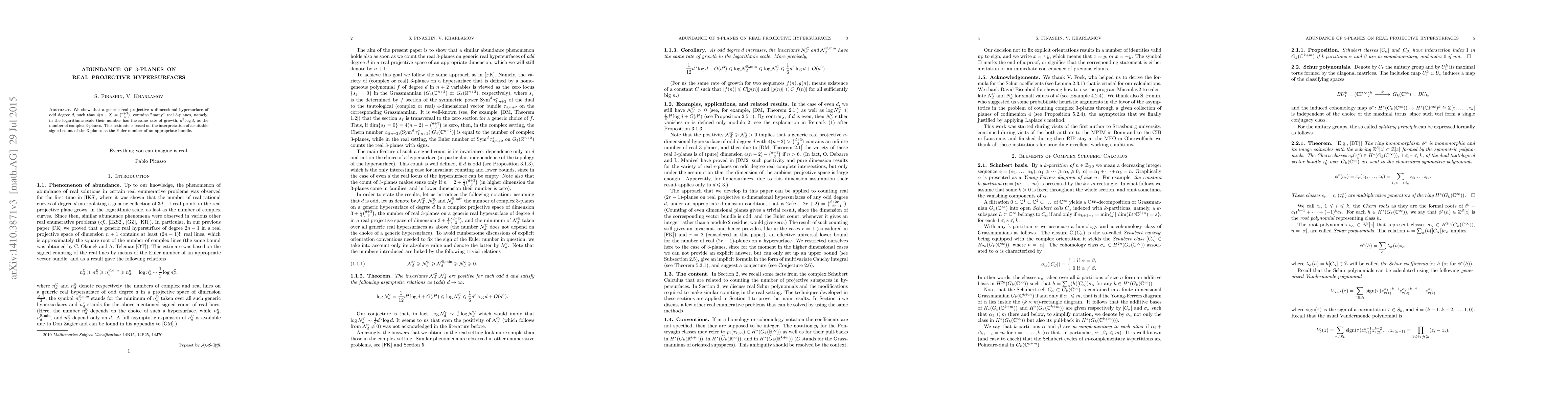 We show that a generic real projective $n$-dimensional hypersurface of odd degree $d$, such that $4(n-2)=\binom{d+3}3$, contains "many" real 3-planes, namely, in the logarithmic scale their number has the same rate of growth, $d^3\log d$, as the number of complex 3-planes. This estimate is based on the interpretation of a suitable signed count of the 3-planes as the Euler number of an appropriate bundle.