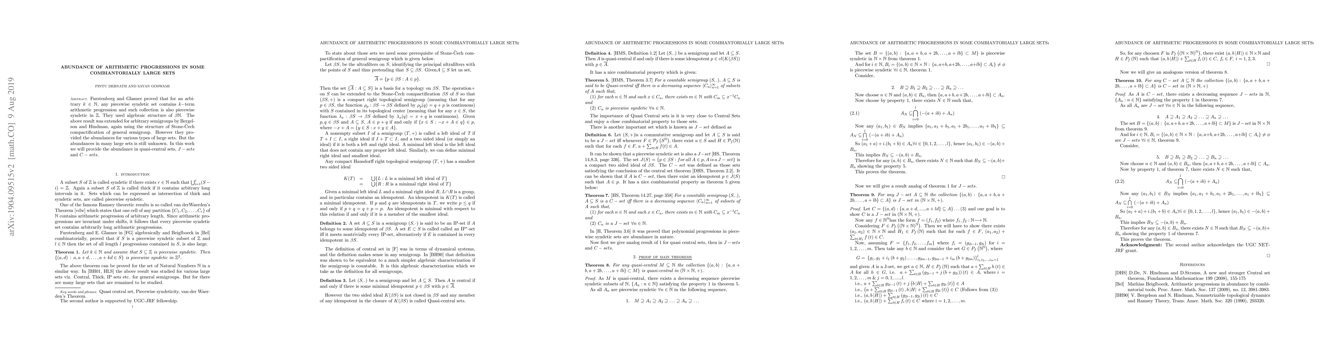 Furstenberg and Glasner proved that for an arbitrary k in N, any piecewise syndetic set contains k length arithmetic progression and such collection is also piecewise syndetic in Z: They used algebraic structure of beta N. The above result was extended for arbitrary semigroups by Bergelson and Hindman, again using the structure of Stone-Cech compactification of general semigroup. However they provided the abundances for various types of large sets. But the abundances in in many large sets is still unknown. In this work we will provide the abundance in Quasi Central sets, J-sets and C-sets.