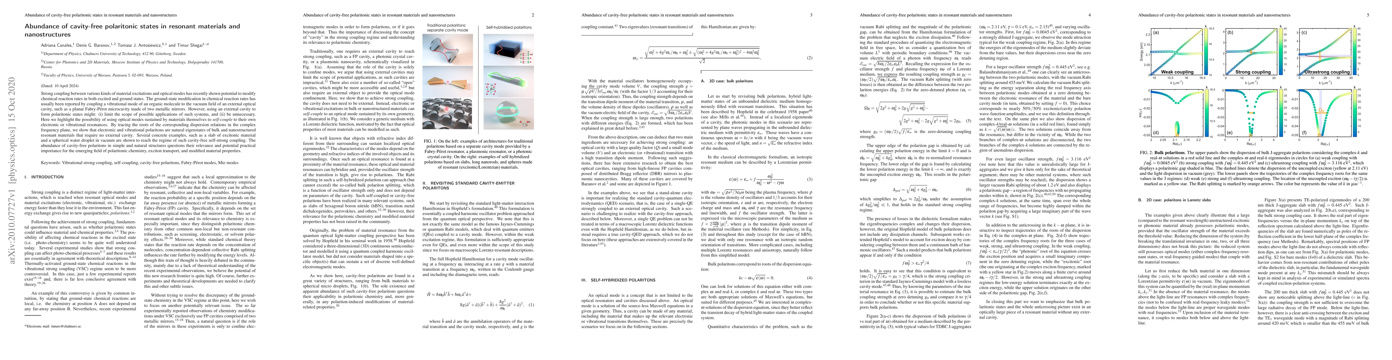 This research highlights the existence of cavity-free polaritonic states in resonant materials and nanostructures, demonstrating that self-coupling of material excitations with their own optical modes can occur without external cavities. Examples like excitonic slabs and water droplets illustrate this phenomenon, suggesting abundant cavity-free polaritons in simple structures with potential implications for fields like polaritonic chemistry and modified material properties.
