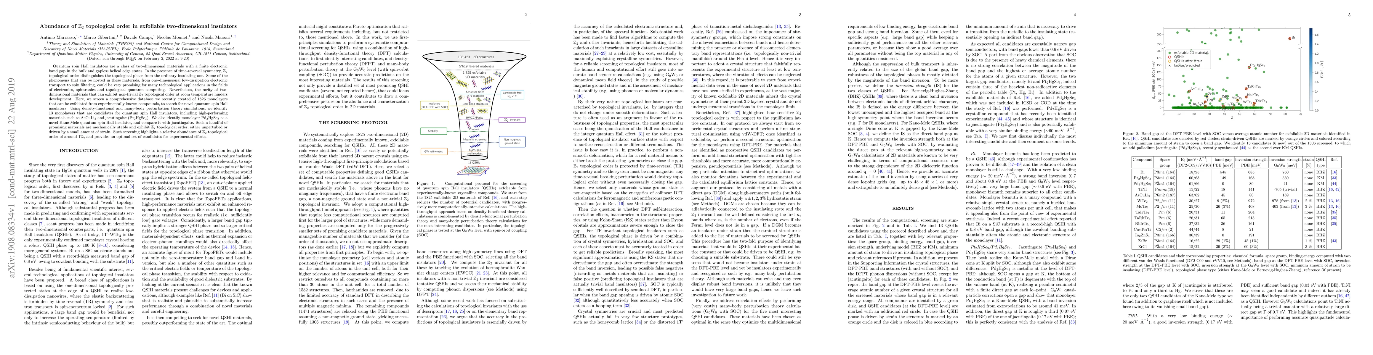 The paper identifies 13 exfoliable two-dimensional materials from a database of 1825 monolayers that exhibit $\mathbb{Z}_2$ topological order, highlighting a 1% abundance of quantum spin Hall insulators with potential for applications in electronics, spintronics, and quantum computing. Notable candidates include AsCuLi$_2$ and Pt$_2$HgSe$_3$.