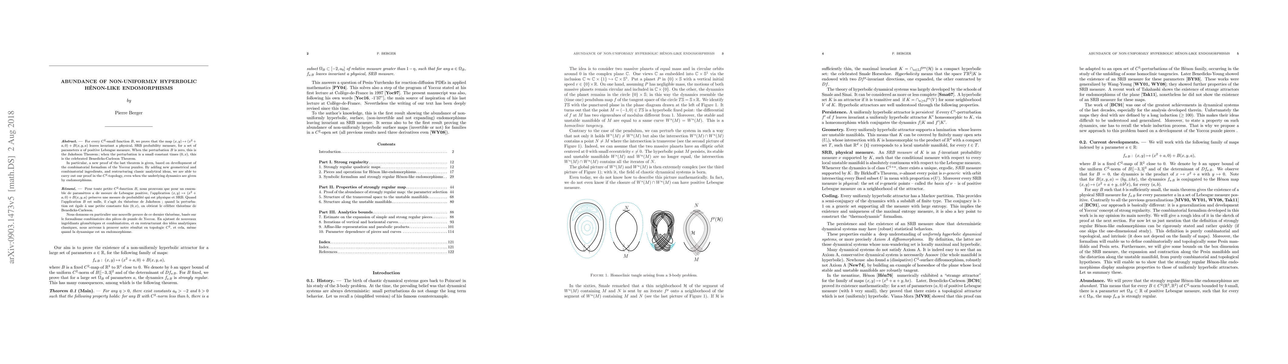 For every $C^2$-small function $B$, we prove that the map $(x,y)\mapsto (x^2+a,0)+B(x,y,a)$ leaves invariant a physical, SRB probability measure, for a set of parameters $a$ of positive Lebesgue measure. When the perturbation $B$ is zero, this is the Jakobson Theorem; when the perturbation is a small constant times $(0,x)$, this is the celebrated Benedicks-Carleson Theorem. In particular, a new proof of the last theorem is given, based on devellopment of the combinatorial formalism of the Yoccoz puzzles. By adding new geometrical and combinatorial ingredients, and restructuring classic analytical ideas, we are able to carry out our proof in the $C^2$-topology, even when the underlying dynamics are given by endomorphisms.