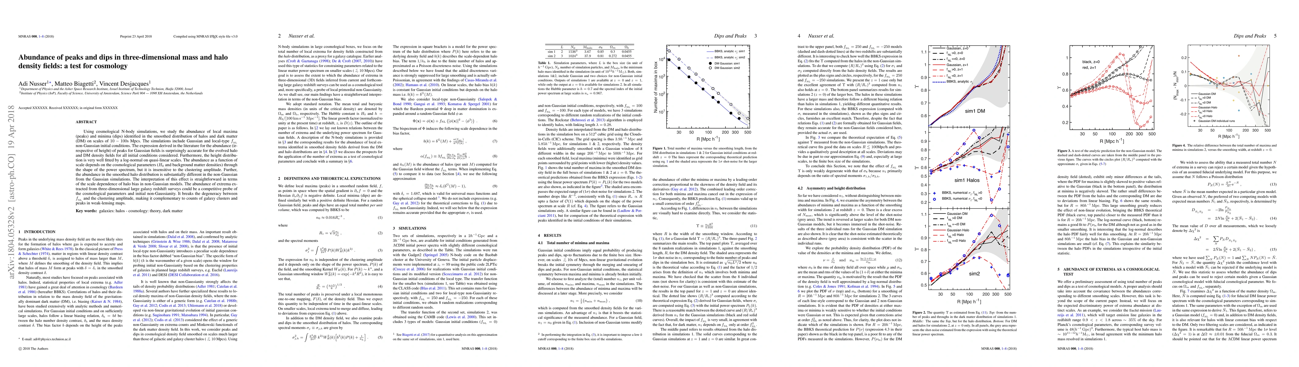 Using cosmological N-body simulations, we study the abundance of local maxima (peaks) and minima (dips) identified in the smoothed distribution of halos and dark matter (DM) on scales of $10-100$s Mpcs. The simulations include Gaussian and local-type $f_{\rm NL}$ non-Gaussian initial conditions. The expression derived in the literature for the abundance (irrespective of height) of peaks for Gaussian fields is surprisingly accurate for the evolved halo and DM density fields for all initial conditions considered. Furthermore, the height distribution is very well fitted by a log-normal on quasi-linear scales. The abundance as a function of scale depends on the cosmological parameters ($H_0$ and background matter densities) through the shape of the power spectrum, but it is insensitive to the clustering amplitude. Further, the abundance in the smoothed halo distribution is substantially different in the non-Gaussian from the Gaussian simulations. The interpretation of this effect is straightforward in terms of the scale dependence of halo bias in non-Gaussian models. The abundance of extrema extracted from three-dimensional large galaxy redshift surveys could be a competitive probe of the cosmological parameters and initial non-Gaussianity. It breaks the degeneracy between $f_{\rm NL}$ and the clustering amplitude, making it complementary to counts of galaxy clusters and peaks in weak-lensing maps.
