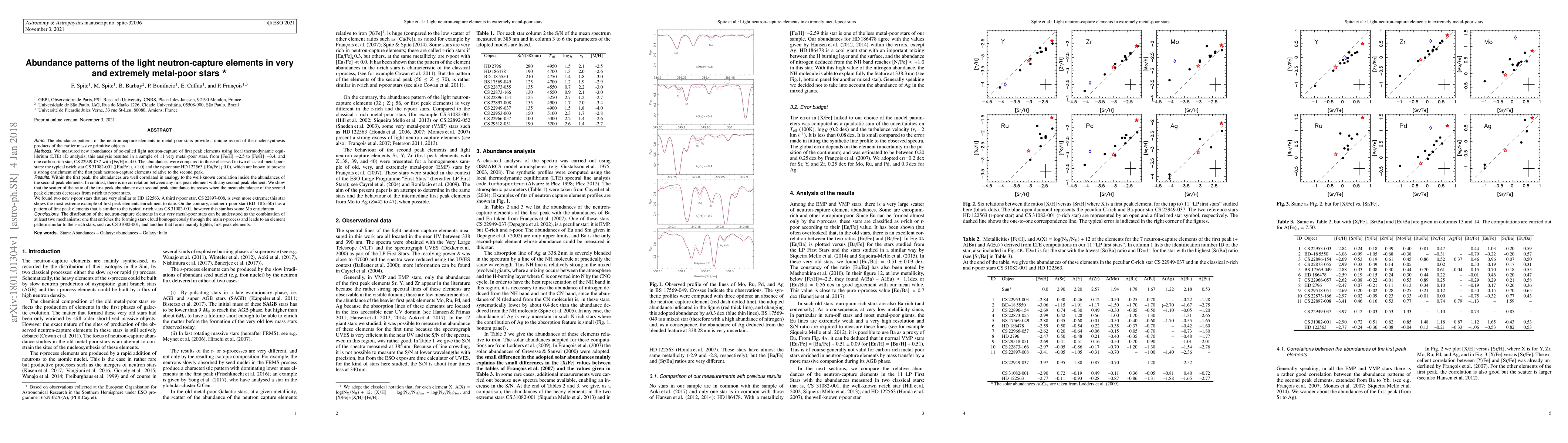 We measured new abundances of so-called light neutron-capture of first peak elements using local thermodynamic equilibrium (LTE) 1D analysis; this analysis resulted in a sample of 11 very metal-poor stars, from [Fe/H]=-2.5 to [Fe/H]=-3.4, and one carbon-rich star, CS 22949-037 with [Fe/H]=-4.0. The abundances were compared to those observed in two classical metal-poor stars: the typical r-rich star CS 31082-001 ([Eu/Fe] > +1.0) and the r-poor star HD 122563 ([Eu/Fe] < 0.0), which are known to present a strong enrichment of the first peak neutron-capture elements relative to the second peak. Within the first peak, the abundances are well correlated in analogy to the well-known correlation inside the abundances of the second-peak elements. In contrast, there is no correlation between any first peak element with any second peak element. We show that the scatter of the ratio of the first peak abundance over second peak abundance increases when the mean abundance of the second peak elements decreases from r-rich to r-poor stars. We found two new r-poor stars that are very similar to HD 122563. A third r-poor star, CS 22897-008, is even more extreme; this star shows the most extreme example of first peak elements enrichment to date. On the contrary, another r-poor star (BD-18 5550) has a pattern of first peak elements that is similar to the typical r-rich stars CS 31082-001, however this star has some Mo enrichment. The distribution of the neutron-capture elements in our very metal-poor stars can be understood as the combination of at least two mechanisms: one that enriches the forming stars cloud homogeneously through the main r-process and leads to an element pattern similar to the r-rich stars, such as CS 31082-001; and another that forms mainly lighter, first peak elements.