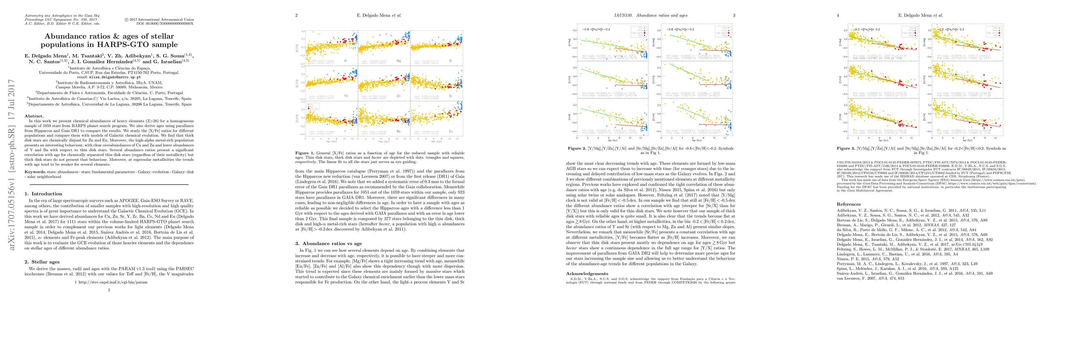 In this work we present chemical abundances of heavy elements (Z$>$28) for a homogeneous sample of 1059 stars from HARPS planet search program. We also derive ages using parallaxes from Hipparcos and Gaia DR1 to compare the results. We study the [X/Fe] ratios for different populations and compare them with models of Galactic chemical evolution. We find that thick disk stars are chemically disjunt for Zn and Eu. Moreover, the high-alpha metal-rich population presents an interesting behaviour, with clear overabundances of Cu and Zn and lower abundances of Y and Ba with respect to thin disk stars. Several abundance ratios present a significant correlation with age for chemically separated thin disk stars (regardless of their metallicity) but thick disk stars do not present that behaviour. Moreover, at supersolar metallicities the trends with age tend to be weaker for several elements.