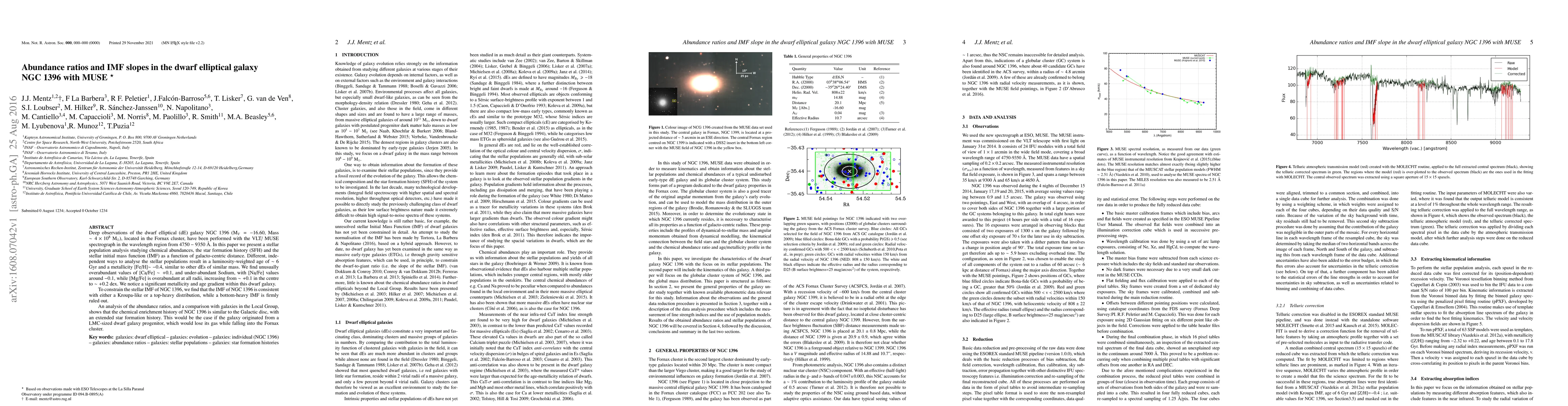 Deep observations of the dwarf elliptical (dE) galaxy NGC 1396 (M$_V = -16.60$, Mass $\sim 4\times10^8$ M$_\odot$), located in the Fornax cluster, have been performed with the VLT/ MUSE spectrograph in the wavelength region from $4750-9350$ \AA{}. In this paper we present a stellar population analysis studying chemical abundances, the star formation history (SFH) and the stellar initial mass function (IMF) as a function of galacto-centric distance. Different, independent ways to analyse the stellar populations result in a luminosity-weighted age of $\sim$ 6 Gyr and a metallicity [Fe/H]$\sim$ $-0.4$, similar to other dEs of similar mass. We find unusually overabundant values of [Ca/Fe] $\sim +0.1$, and under-abundant Sodium, with [Na/Fe] values around $-0.1$, while [Mg/Fe] is overabundant at all radii, increasing from $\sim+0.1$ in the centre to $\sim +0.2$ dex. We notice a significant metallicity and age gradient within this dwarf galaxy. To constrain the stellar IMF of NGC 1396, we find that the IMF of NGC 1396 is consistent with either a Kroupa-like or a top-heavy distribution, while a bottom-heavy IMF is firmly ruled out. An analysis of the abundance ratios, and a comparison with galaxies in the Local Group, shows that the chemical enrichment history of NGC 1396 is similar to the Galactic disc, with an extended star formation history. This would be the case if the galaxy originated from a LMC-sized dwarf galaxy progenitor, which would lose its gas while falling into the Fornax cluster.