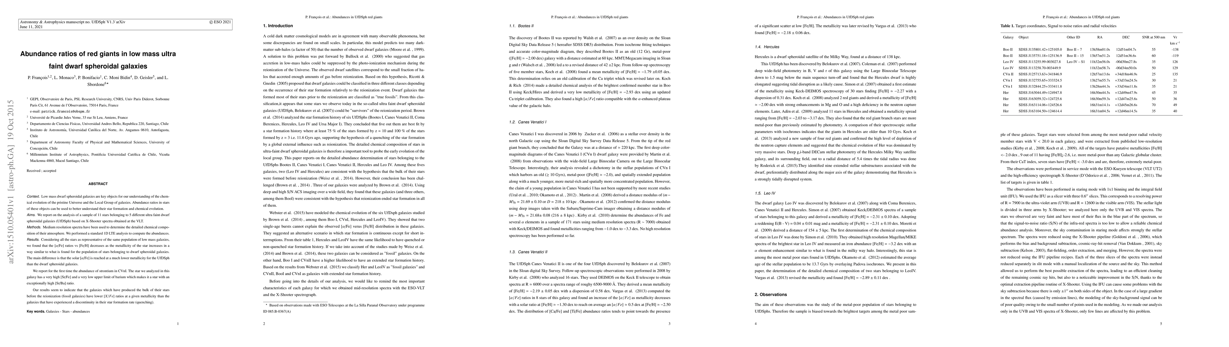 This study analyzes the abundance ratios of red giants in low mass ultra faint dwarf spheroidal galaxies (UfDSph), revealing that [alpha/Fe] ratios decrease with increasing metallicity similarly to other dwarf galaxies but reach solar values at lower metallicities. Notably, one star in CVnI exhibits an exceptionally high [Sr/Ba] ratio, suggesting distinct star formation histories in these galaxies.