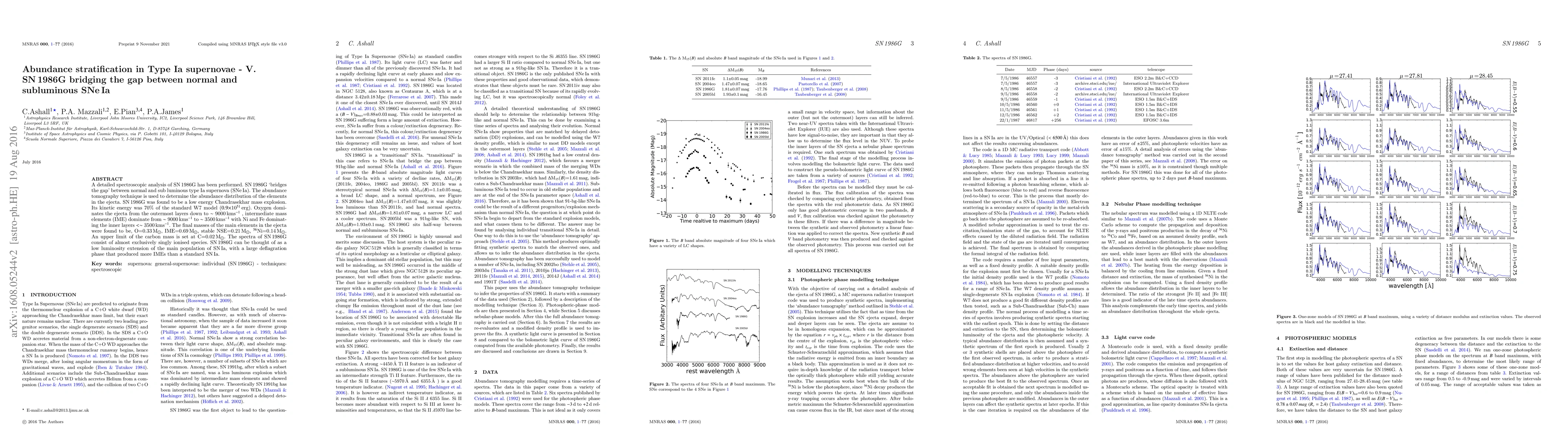 A detailed spectroscopic analysis of SN 1986G has been performed. SN 1986G `bridges the gap' between normal and sub luminous type Ia supernova (SNe Ia). The abundance tomography technique is used to determine the abundance distribution of the elements in the ejecta. SN 1986G was found to be a low energy Chandrasekhar mass explosion. Its kinetic energy was 70% of the standard W7 model (0.9x10$^{51}$erg). Oxygen dominates the ejecta from the outermost layers down to $\sim$9000kms$^{-1}$ , intermediate mass elements (IME) dominate from $\sim$ 9000kms$^{-1}$ to $\sim$ 3500kms$^{-1}$ with Ni and Fe dominating the inner layers $<\sim$ 3500kms$^{-1}$. The final masses of the main elements in the ejecta were found to be, O=0.33M, IME=0.69M, stable NSE=0.21M, $^{56}$Ni=0.14M. An upper limit of the carbon mass is set at C=0.02M. The spectra of SN1986G consist of almost exclusively singly ionised species. SN1986G can be thought of as a low luminosity extension of the main population of SN Ia, with a large deflagration phase that produced more IMEs than a standard SN Ia.