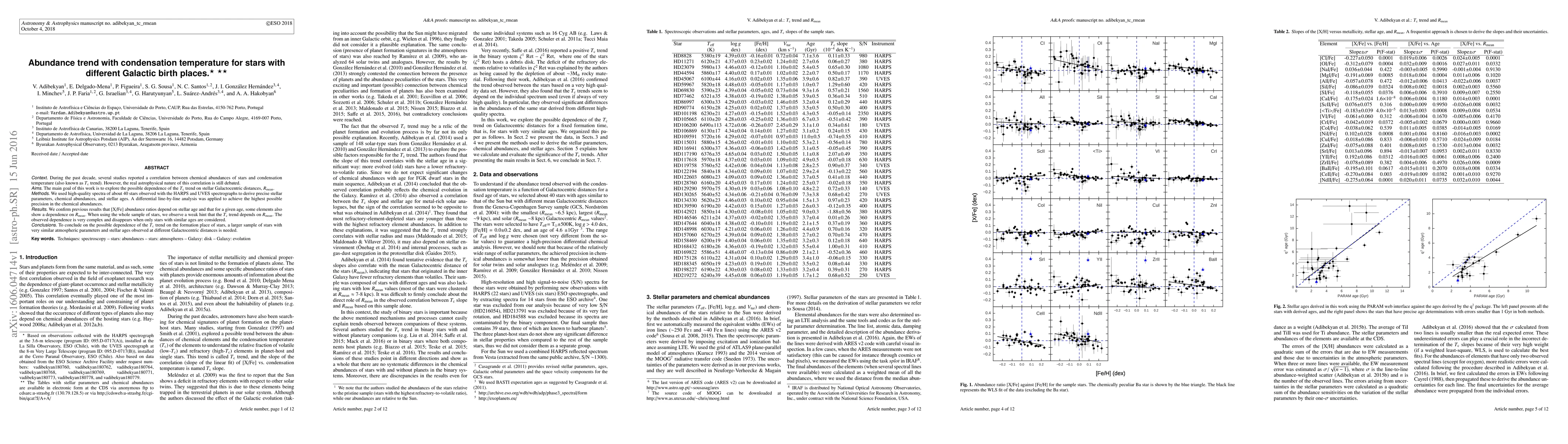 During the past decade, several studies reported a correlation between chemical abundances of stars and condensation temperature (also known as Tc trend). However, the real astrophysical nature of this correlation is still debated. The main goal of this work is to explore the possible dependence of the Tc trend on stellar Galactocentric distances, Rmean. We used high-quality spectra of about 40 stars observed with the HARPS and UVES spectrographs to derive precise stellar parameters, chemical abundances, and stellar ages. A differential line-by-line analysis was applied to achieve the highest possible precision in the chemical abundances. We confirm previous results that [X/Fe] abundance ratios depend on stellar age and that for a given age, some elements also show a dependence on Rmean. When using the whole sample of stars, we observe a weak hint that the Tc trend depends on Rmean. The observed dependence is very complex and disappears when only stars with similar ages are considered. To conclude on the possible dependence of the Tc trend on the formation place of stars, a larger sample of stars with very similar atmospheric parameters and stellar ages observed at different Galactocentric distances is needed