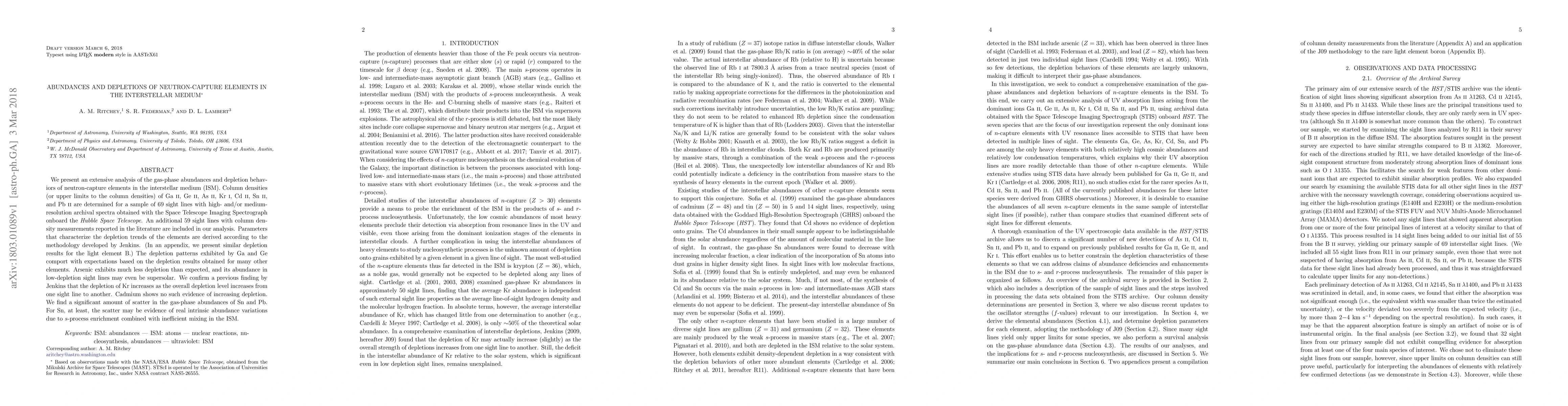 This study analyzes gas-phase abundances and depletion behaviors of neutron-capture elements in the interstellar medium (ISM), finding varied depletion patterns for Ga, Ge, As, Kr, Cd, Sn, and Pb. Key discoveries include Arsenic's less depletion than expected and significant scatter in Sn and Pb abundances, potentially indicating s-process enrichment and inefficient ISM mixing.
