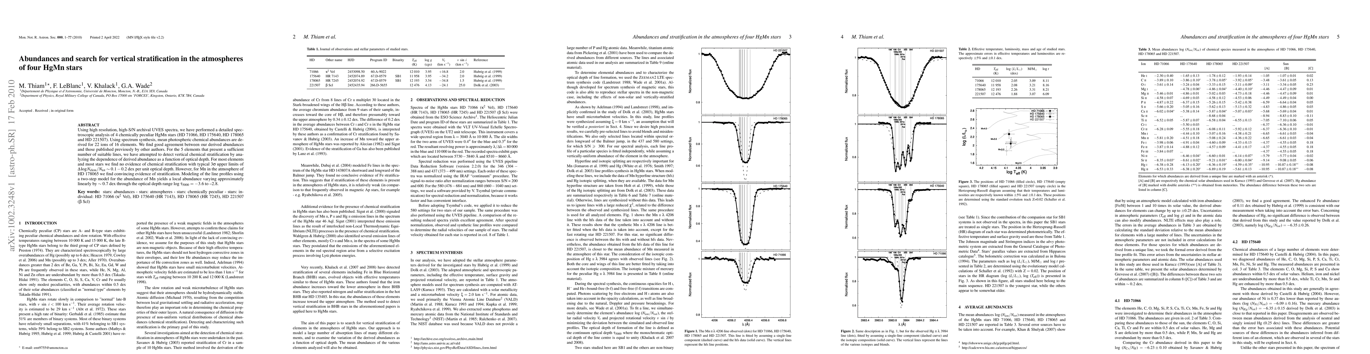 This study uses high-resolution UVES spectra to analyze the atmospheres of four HgMn stars, deriving mean photospheric abundances for 22 ions of 16 elements and finding good agreement with previous results. While no significant vertical chemical stratification is detected for most elements, Mn in HD 178065 shows convincing stratification, with a local abundance variation of ~0.7 dex over the optical depth range.