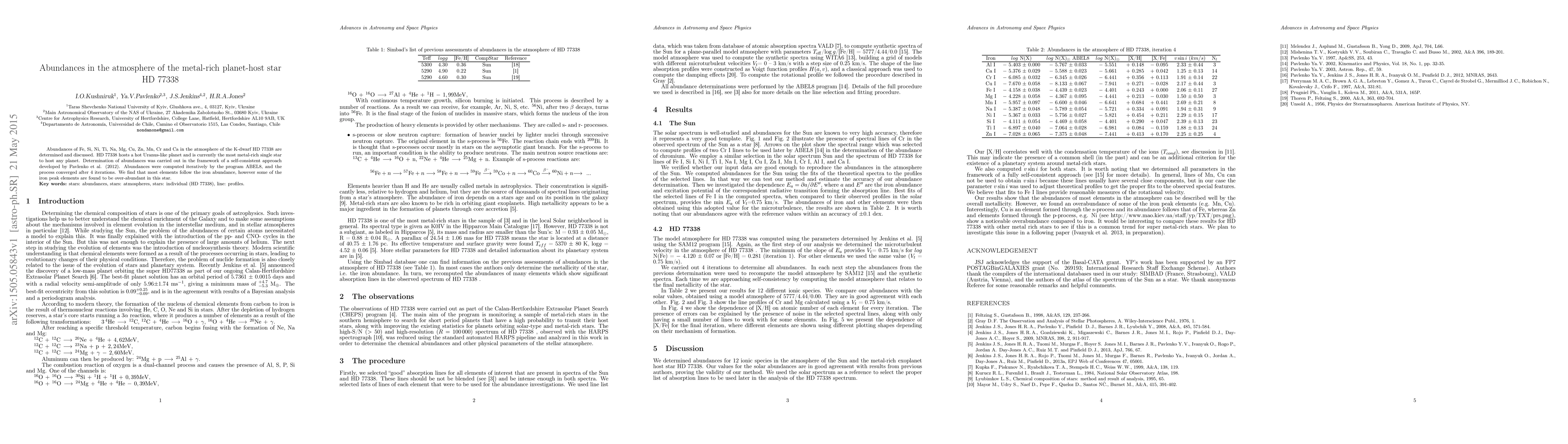 Abundances of Fe, Si, Ni, Ti, Na, Mg, Cu, Zn, Mn, Cr and Ca in the atmosphere of the K-dwarf HD 77338 are determined and discussed. HD 77338 hosts a hot Uranus-like planet and is currently the most metal-rich single star to host any planet. Determination of abundances was carried out in the framework of a self-consistent approach developed by Pavlenko et al. (2012). Abundances were computed iteratively by the program ABEL8, and the process converged after 4 iterations. We find that most elements follow the iron abundance, however some of the iron peak elements are found to be over-abundant in this star.
