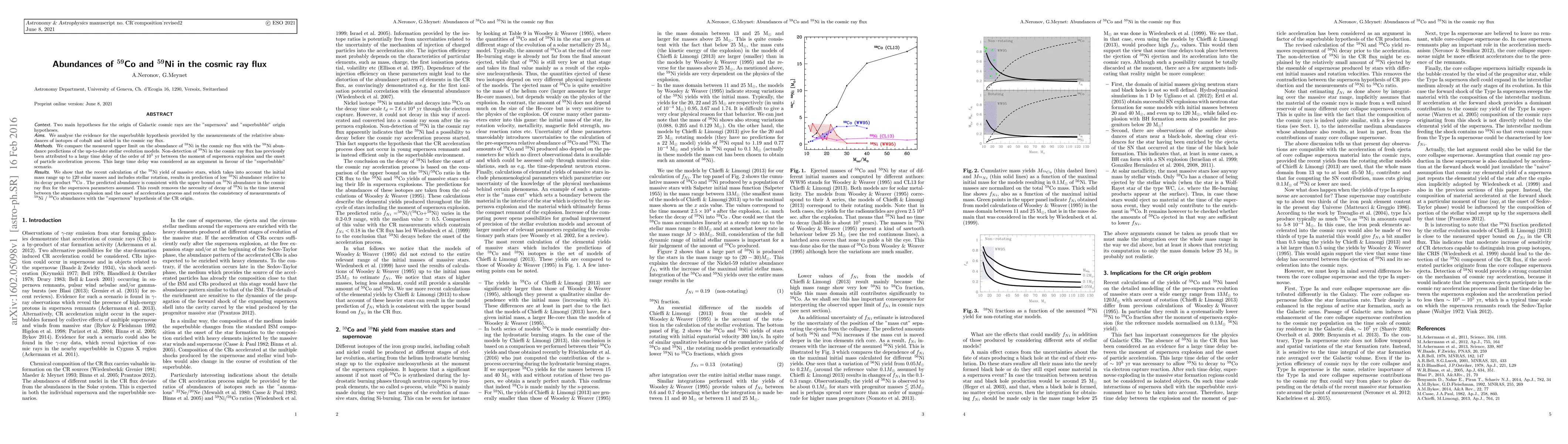 Two main hypotheses for the origin of Galactic cosmic rays are the "supernova" and "superbubble" origin hypotheses. We analyse the evidence for the superbubble hypothesis provided by the measurements of the relativive abundances of isotopes of cobalt and nickel in the cosmic ray flux. We compare the measured upper limit on the abundance of 59Ni in the cosmic ray flux with the 59Ni abundance predictions of the up-to-date stellar evolution models. Non-detection of 59Ni in the cosmic ray flux has previously been attributed to a large time delay of the order of 1e5 yr between the moment of supernova explosion and the onset of particle acceleration process. This large time delay was considered as an argument in favour of the "superbubble" scenario. We show that the recent calculation of the 59Ni yield of massive stars, which takes into account the initial mass range up to 120 solar masses and includes stellar rotation, results in prediction of low 59Ni abundance relative to its decay product 59Co. The predicted abundance is consistent with the upper bound on 59Ni abundance in the cosmic ray flux for the supernova parameters assumed. This result removes the necessity of decay of 59Ni in the time interval between the supernova explosion and the onset of acceleration process and restores the consistency of measurements of 59Ni / 59Co abundances with the "supernova" hypothesis of the CR origin.