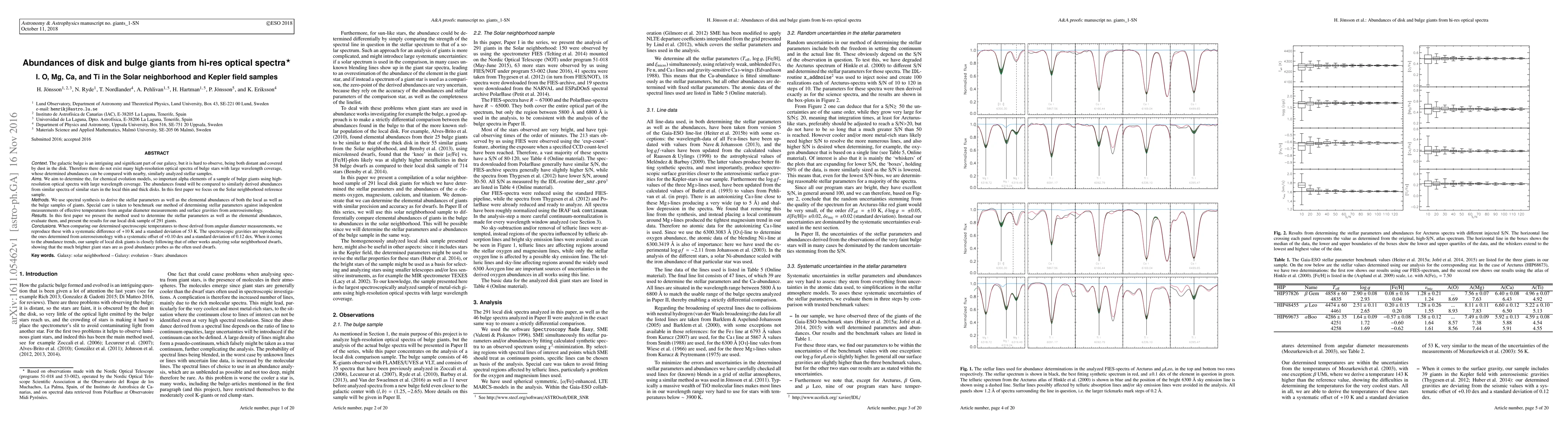 The galactic bulge is a significant part of our galaxy, but it is hard to observe, being both distant and covered by dust in the disk. Therefore there do not exist many hi-res optical spectra of bulge stars with large wavelength coverage, whose determined abundances can be compared with nearby, similarly analyzed stellar samples. We aim to determine the, for chemical evolution models, so important alpha elements of a sample of bulge giants using hi-res optical spectra with large wavelength coverage. The abundances found will be compared to similarly derived abundances from similar spectra of similar stars in the local thin and thick disks. In this first paper we focus on the Solar neighborhood reference sample. We use spectral synthesis to derive the stellar parameters as well as the elemental abundances of both the local as well as the bulge samples of giants. Special care is taken to benchmark our method of determining stellar parameters against independent measurements of effective temperatures from angular diameter measurements and surface gravities from asteroseismology. In this first paper we present the method used to determine the stellar parameters as well as the elemental abundances, evaluate them, and present the results for our local disk sample of 291 giants. When comparing our determined spectroscopic temperatures to those derived from angular diameter measurements, we reproduce these with a systematic difference of +10 K and a standard deviation of 53 K. The spectroscopic gravities are reproducing the ones determined from asteroseismology with a systematic offset of +0.10 dex and a standard deviation of 0.12 dex. When it comes to the abundance trends, our sample of local disk giants is closely following that of other works analyzing solar neighborhood dwarfs, showing that the much brighter giant stars are as good abundance probes as the often used dwarfs.