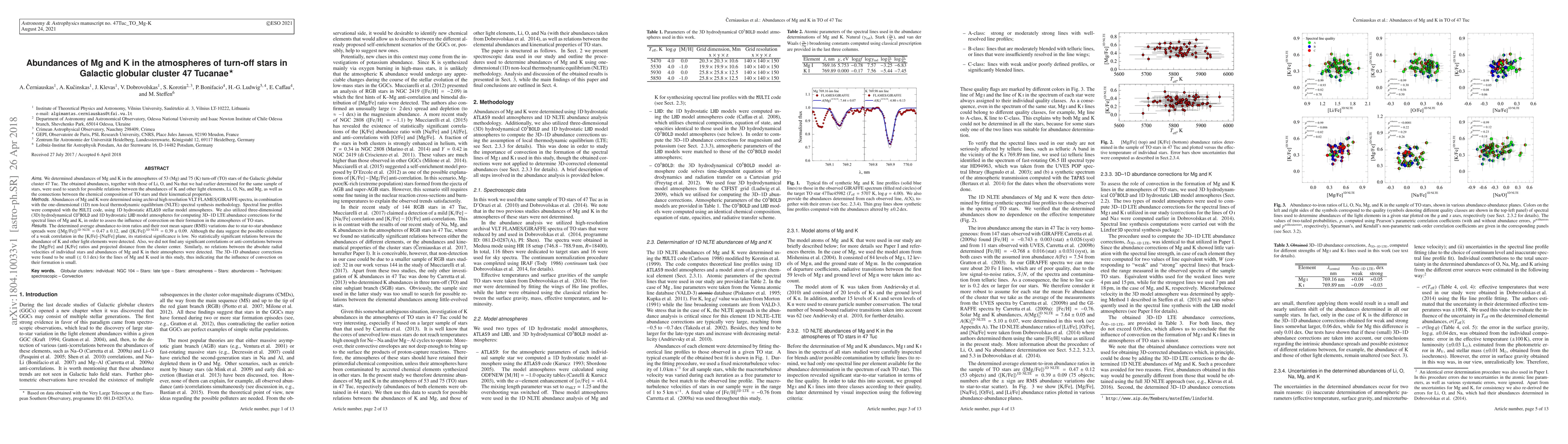 This study determined Mg and K abundances in 53 and 75 turn-off stars of the globular cluster 47 Tucanae using VLT spectra and NLTE spectral synthesis. No significant correlations were found between Mg, K, and other light elements, nor between elemental abundances and kinematic properties. Convection's influence on Mg and K line formation was found to be minimal.