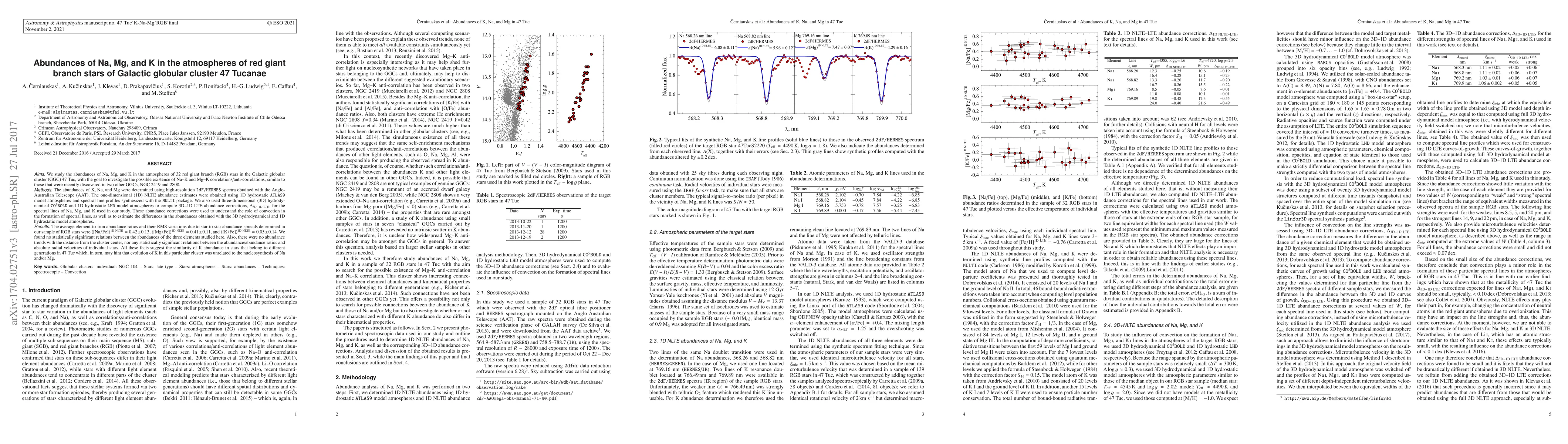 We study the abundances of Na, Mg, and K in the atmospheres of 32 RGB stars in the Galactic globular cluster (GGC) 47 Tuc, with the goal to investigate the possible existence of Na-K and Mg-K correlations/anti-correlations, similar to those that were recently discovered in two other GGCs, NGC 2419 and 2808. The abundances of K, Na, and Mg were determined using high-resolution 2df spectra obtained with the AAT. The 1D NLTE abundance estimates were obtained using 1D hydrostatic ATLAS9 model atmospheres and spectral line profiles synthesized with the MULTI package. We also used 3D hydrodynamical CO5BOLD and 1D hydrostatic LHD model atmospheres to compute 3D-1D LTE abundance corrections, $\Delta_{\rm 3D-1D~LTE}$, for the spectral lines of Na, Mg, and K used in our study. These abundance corrections were used to understand the role of convection in the formation of spectral lines, as well as to estimate the differences in the abundances obtained with the 3D hydrodynamical and 1D hydrostatic model atmospheres. The average element-to-iron abundance ratios and their RMS variations due to star-to-star abundance spreads determined in our sample of RGB stars were $\langle{\rm [Na/Fe]}\rangle^{\rm 1D~NLTE}=0.42\pm0.13$, $\langle{\rm [Mg/Fe]}\rangle^{\rm 1D~NLTE}=0.41\pm0.11$, and $\langle{\rm [K/Fe]}\rangle^{\rm 1D~NLTE}=0.05\pm0.14$. We found no statistically significant relations between the abundances of the three elements studied here. Also, there were no abundance trends with the distance from the cluster center, nor any statistically significant relations between the abundance/abundance ratios and absolute radial velocities of individual stars. All these facts suggest the similarity of K abundance in stars that belong to different generations in 47 Tuc which, in turn, may hint that evolution of K in this particular cluster was unrelated to the nucleosynthesis of Na and/or Mg.