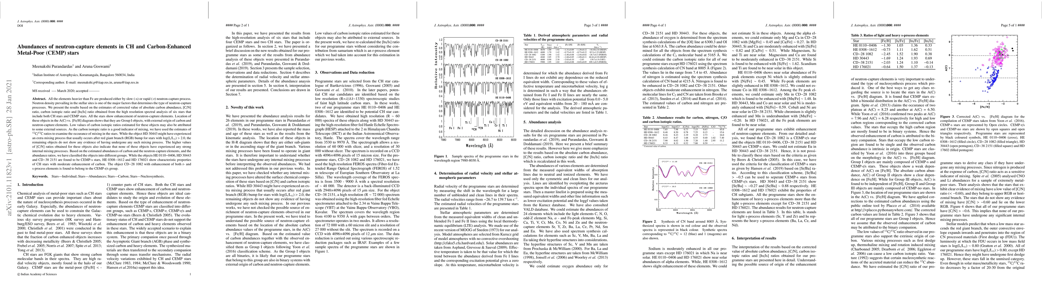 All the elements heavier than Fe are produced either by slow (-s) or rapid (-r) neutron-capture process. Neutron density prevailing in the stellar sites is one of the major factors that determines the type of neutron-capture processes. We present the results based on the estimates of corrected value of absolute carbon abundance, [C/N] ratio, carbon isotopic ratio and [hs/ls] ratio obtained from the high resolution spectral analysis of six stars that include both CH stars and CEMP stars. All the stars show enhancement of neutron-capture elements. Location of these objects in the A(C) vs. [Fe/H] diagram shows that they are Group I objects, with external origin of carbon and neutron-capture elements. Low values of carbon isotopic ratios estimated for these objects may also be attributed to some external sources. As the carbon isotopic ratio is a good indicator of mixing, we have used the estimates of 12C/13C ratios to examine the occurance of mixing in the stars. While the object HD 30443 might have experienced an extra mixing process that usually occurs after red giant branch (RGB) bump for stars with log(L/L0) > 2.0, the remaining objects do not show any evidence of having undergone any such mixing process. The higher values of [C/N] ratios obtained for these objects also indicate that none of these objects have experienced any strong internal mixing processes. Based on the estimated abundances of carbon and the neutron-capture elements, and the abundance ratios, we have classified the objects into different groups. While the objects HE 0110-0406, HD 30443 and CD-38 2151 are found to be CEMP-s stars, HE 0308-1612 and HD 176021 show characteristic properties of CH stars with moderate enhancement of carbon. The object CD-28 1082 with enhancement of both r- and s-process elements is found to belong to the CEMP-r/s group.