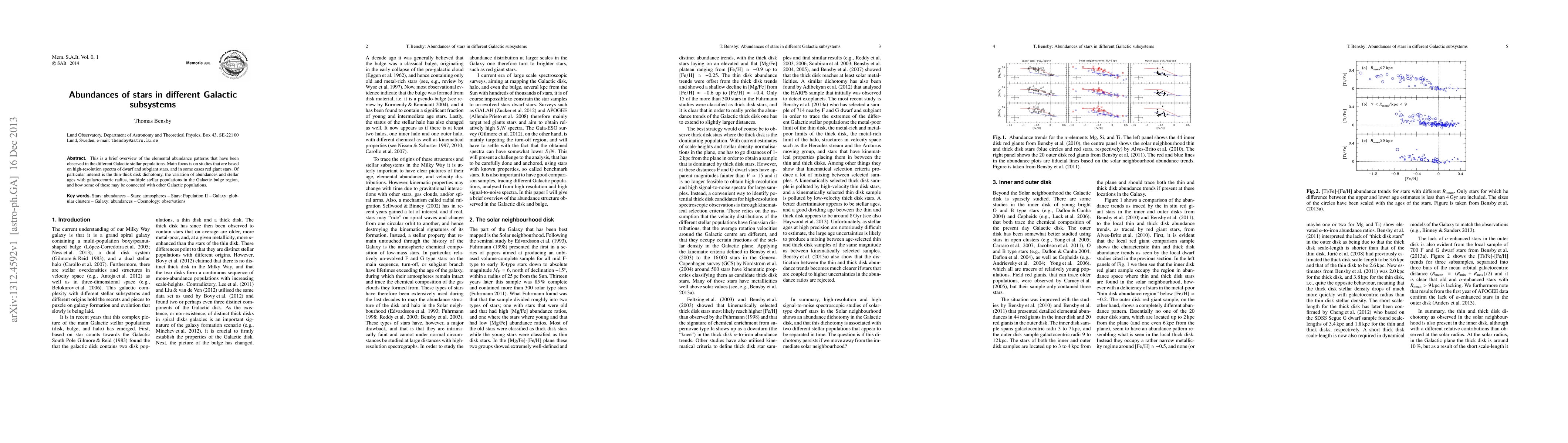 This is a brief overview of the elemental abundance patterns that have been observed in the different Galactic stellar populations. Main focus is on studies that are based on high-resolution spectra of dwarf and subgiant stars, and in some cases red giant stars. Of particular interest is the thin-thick disk dichotomy, the variation of abundances and stellar ages with galactocentric radius, multiple stellar populations in the Galactic bulge region, and how some of these may be connected with other Galactic populations.