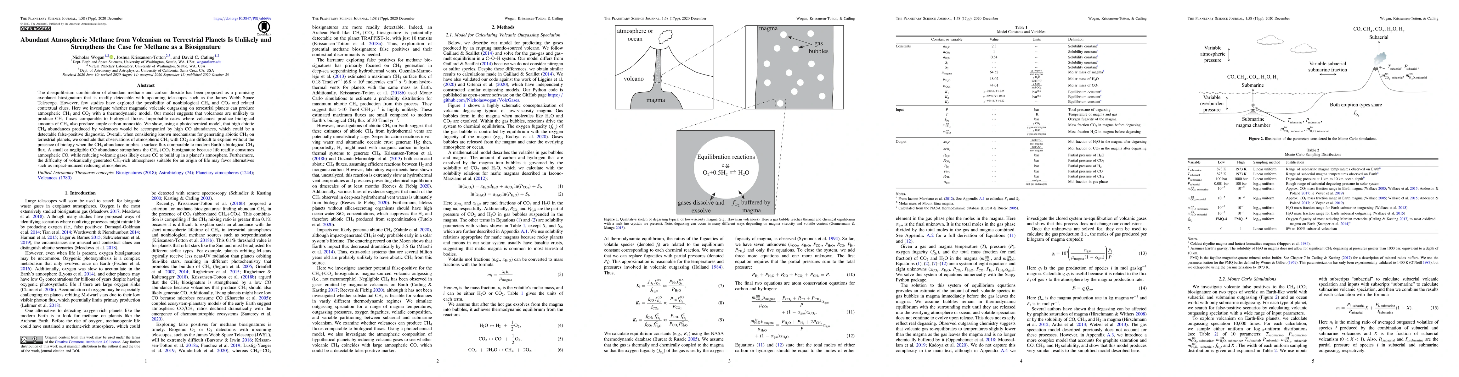 This paper concludes that volcanic outgassing on terrestrial planets is unlikely to produce significant amounts of atmospheric methane (CH4) comparable to biological sources, reinforcing methane as a strong biosignature. It also finds that high abiotic CH4 would likely accompany high carbon monoxide (CO) levels, complicating detection.