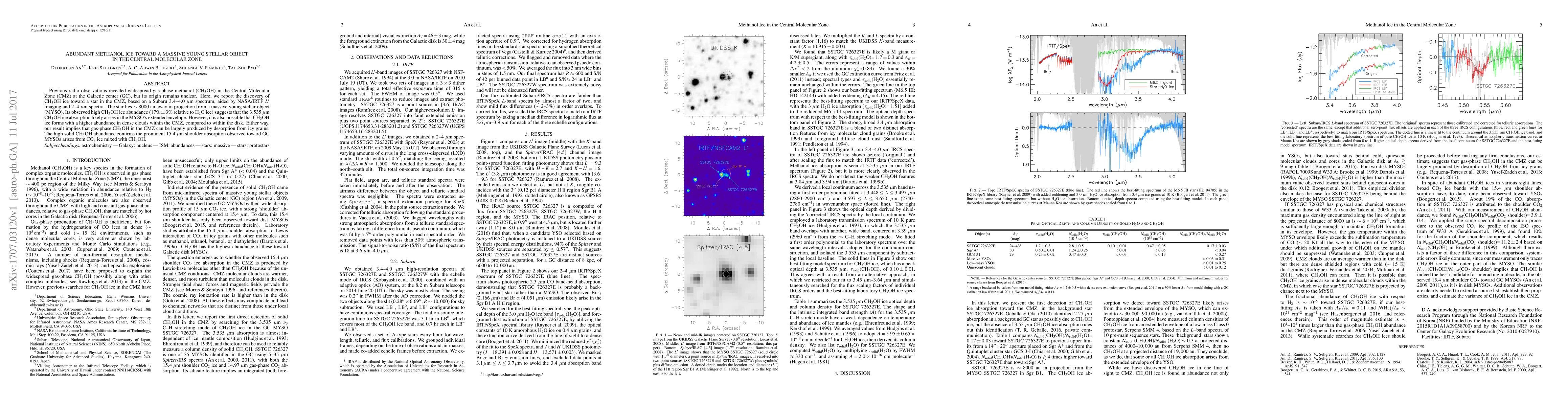 This study discovers abundant methanol ice (CH$_3$OH) in the Central Molecular Zone near a massive young stellar object, suggesting its formation in the object's extended envelope or dense clouds. The high solid CH$_3$OH abundance implies gas-phase methanol likely originates from desorption of icy grains.