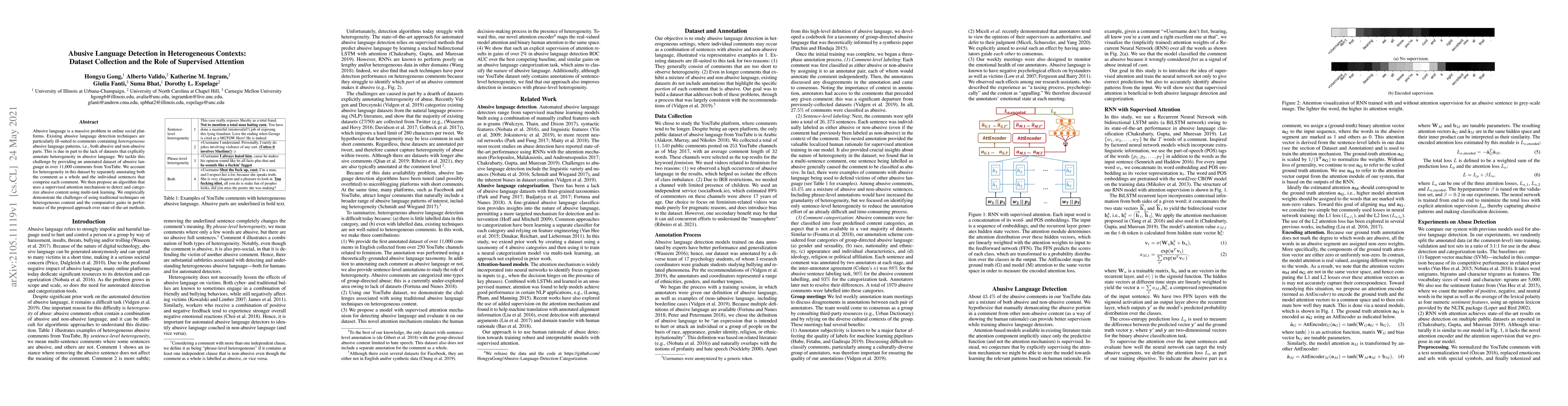 Abusive language is a massive problem in online social platforms. Existing abusive language detection techniques are particularly ill-suited to comments containing heterogeneous abusive language patterns, i.e., both abusive and non-abusive parts. This is due in part to the lack of datasets that explicitly annotate heterogeneity in abusive language. We tackle this challenge by providing an annotated dataset of abusive language in over 11,000 comments from YouTube. We account for heterogeneity in this dataset by separately annotating both the comment as a whole and the individual sentences that comprise each comment. We then propose an algorithm that uses a supervised attention mechanism to detect and categorize abusive content using multi-task learning. We empirically demonstrate the challenges of using traditional techniques on heterogeneous content and the comparative gains in performance of the proposed approach over state-of-the-art methods.