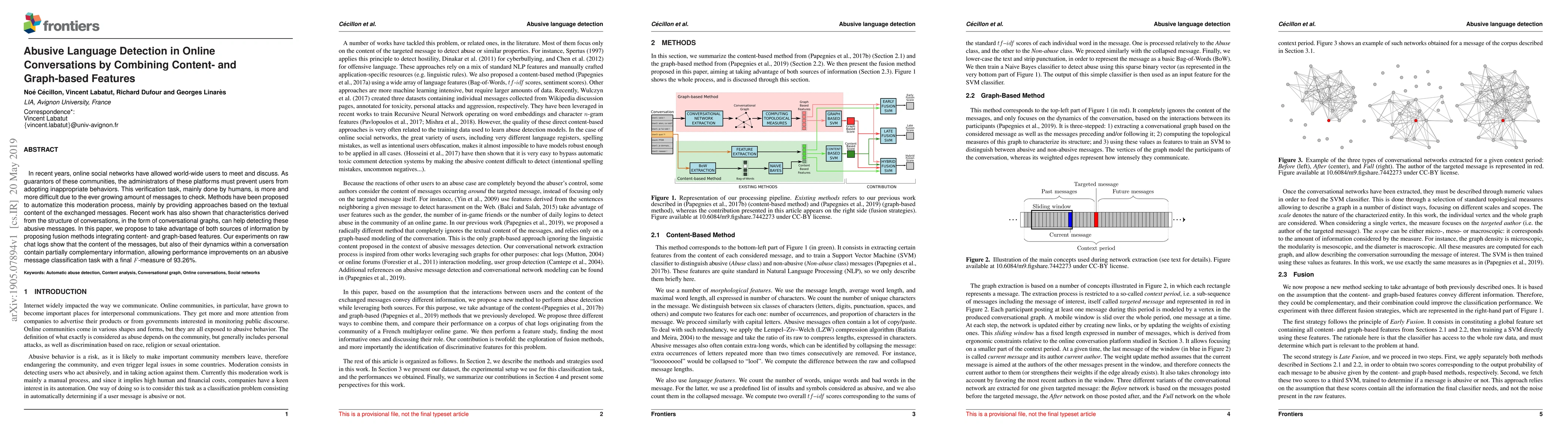 This paper proposes a method to detect abusive language in online conversations by combining content-based and graph-based features. Experiments show that integrating both types of information leads to a significant improvement in abusive message classification, achieving an F-measure of 93.26%.