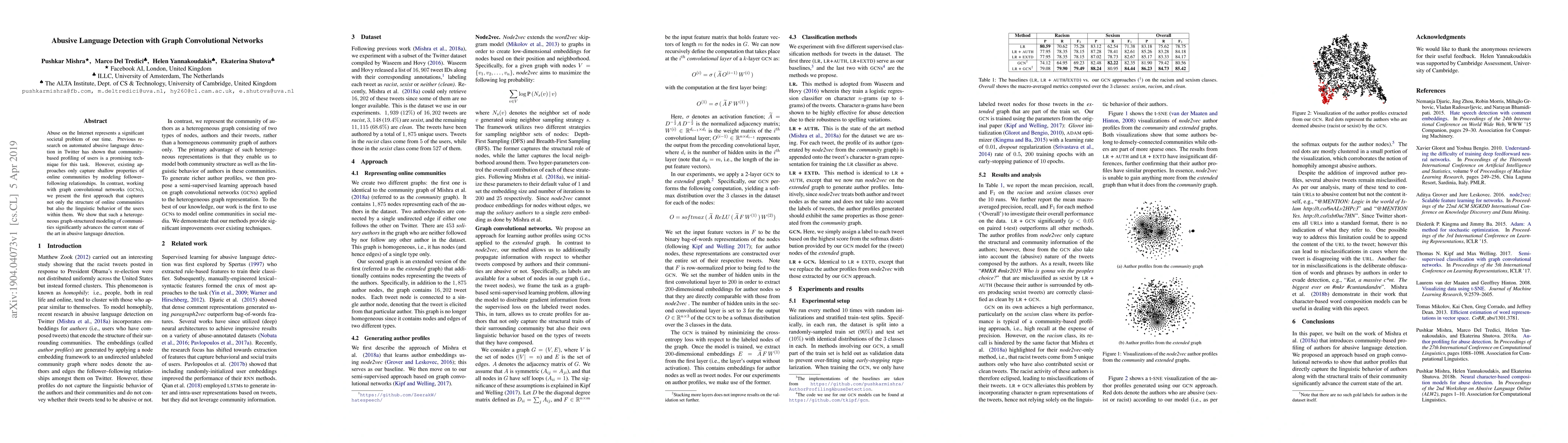 This paper proposes a novel method using graph convolutional networks (GCNs) to detect abusive language on Twitter, capturing both community structure and user linguistic behavior for a more accurate detection than previous shallow approaches. The results show significant improvements over the current state of the art in abusive language detection.
