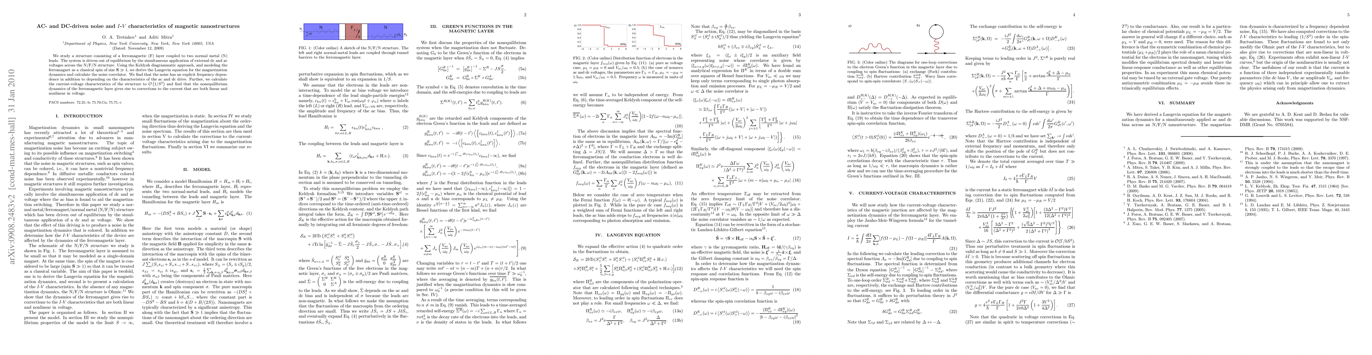 We study a structure consisting of a ferromagnetic (F) layer coupled to two normal metal (N) leads. The system is driven out of equilibrium by the simultaneous application of external dc and ac voltages across the N/F/N structure. Using the Keldysh diagrammatic approach, and modeling the ferromagnet as a classical spin of size S >> 1, we derive the Langevin equation for the magnetization dynamics and calculate the noise correlator. We find that the noise has an explicit frequency dependence in addition to depending on the characteristics of the ac and dc drive. Further, we calculate the current-voltage characteristics of the structure to O(1/S^2) and find that the nonequilibrium dynamics of the ferromagnetic layer gives rise to corrections to the current that are both linear and nonlinear in voltage.