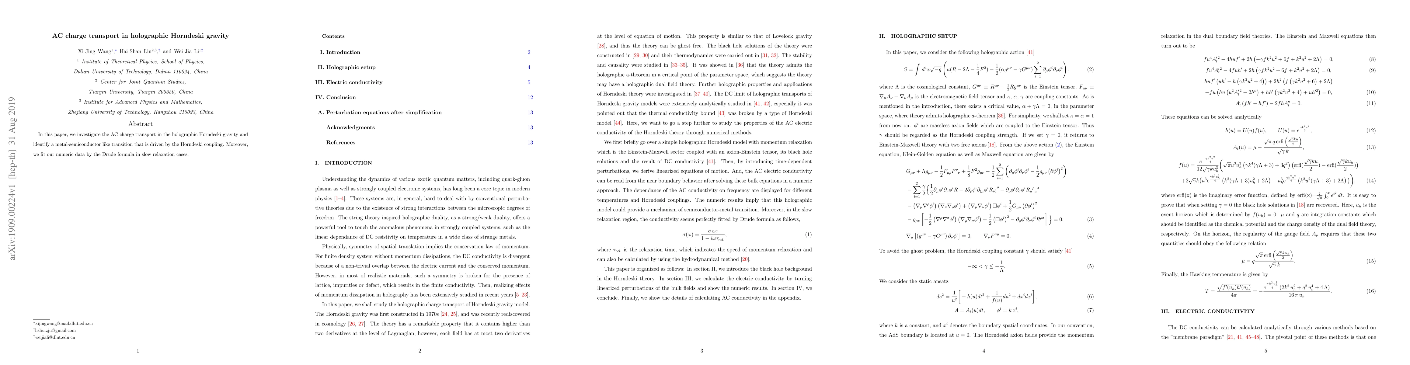 Researchers investigated AC charge transport in holographic Horndeski gravity, discovering a metal-semiconductor transition driven by the Horndeski coupling, and applied the Drude formula to model slow relaxation cases.
