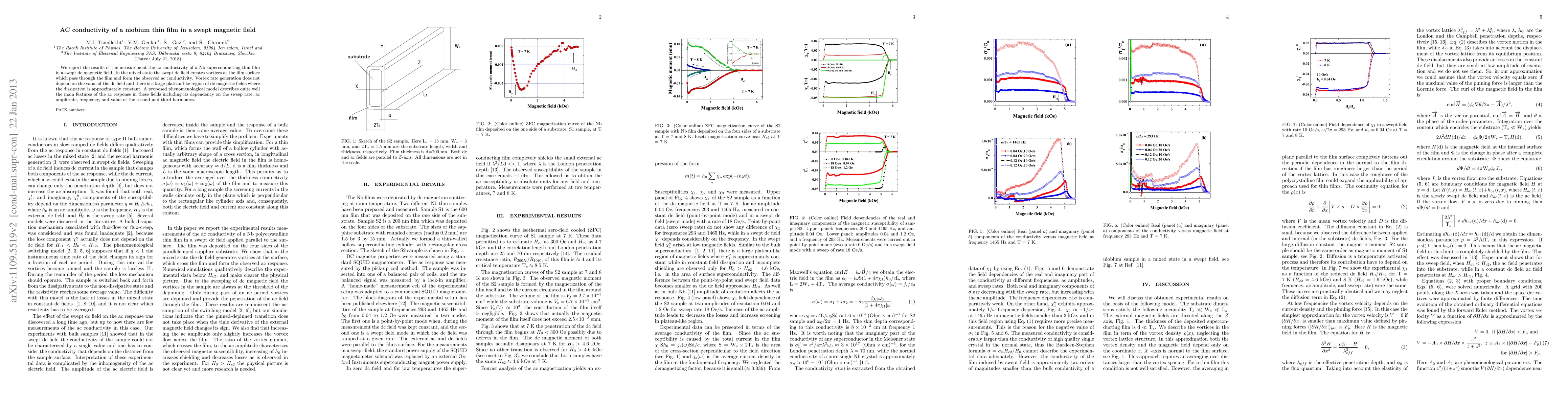 This study investigates the ac conductivity of a niobium thin film under a swept dc magnetic field, finding that vortex motion generates ac conductivity in the mixed state. A phenomenological model effectively explains the ac response's dependence on various factors, including sweep rate and frequency, with a notable plateau in dissipation over a range of magnetic fields.