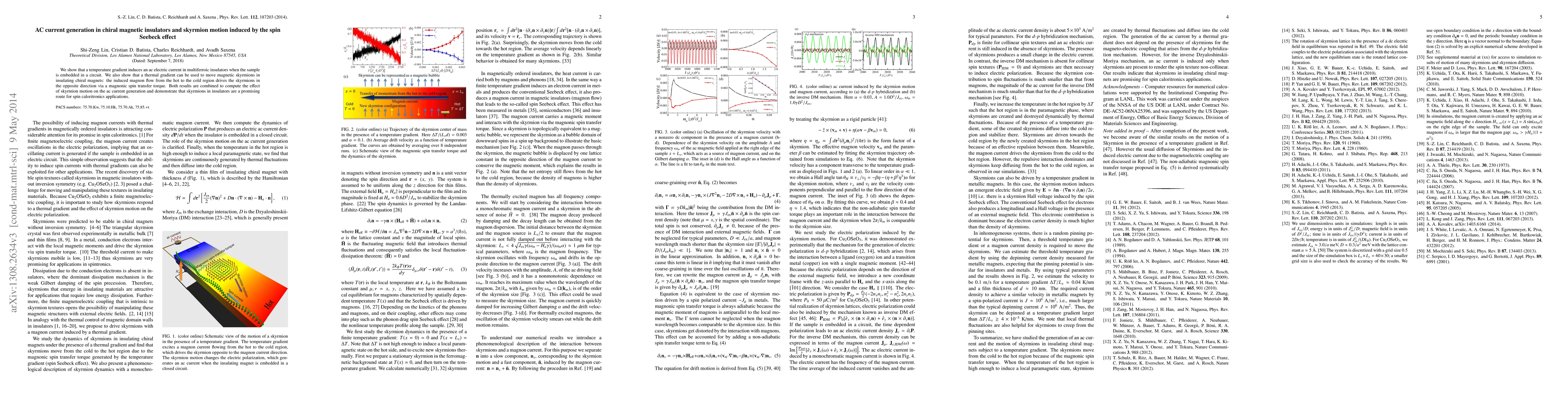 This paper demonstrates that a temperature gradient can generate an ac electric current in multiferroic chiral magnetic insulators and can also move magnetic skyrmions via the spin Seebeck effect, highlighting the potential of skyrmions in spin caloritronics applications. The study combines these effects to explore the impact of skyrmion motion on ac current generation.