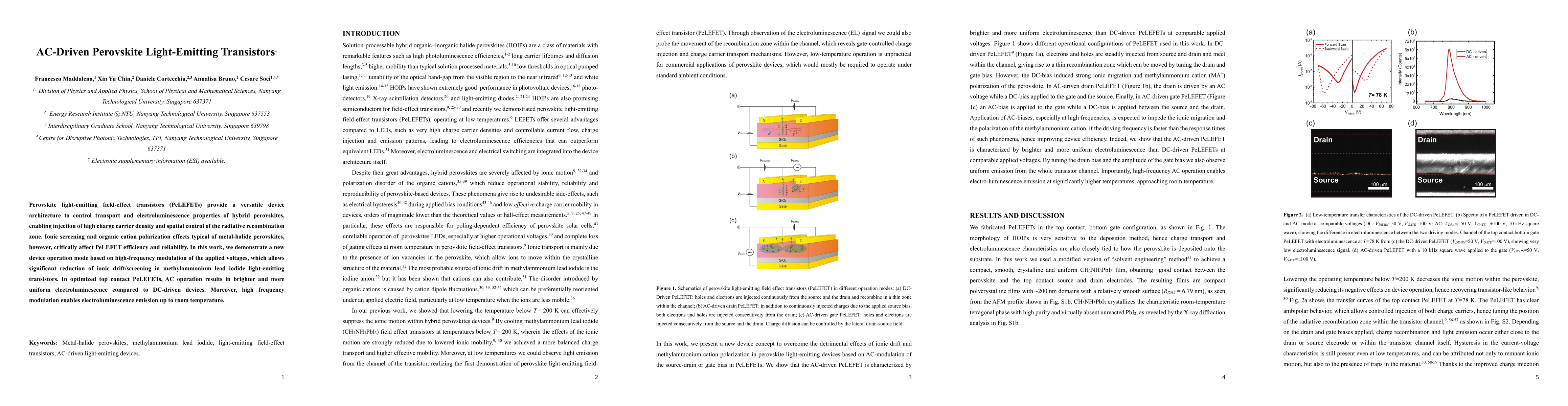 This paper demonstrates AC-driven perovskite light-emitting field-effect transistors (PeLEFETs) that significantly reduce ionic drift and improve electroluminescence efficiency and uniformity. High-frequency modulation enhances brightness and enables operation at room temperature, outperforming DC-driven devices.