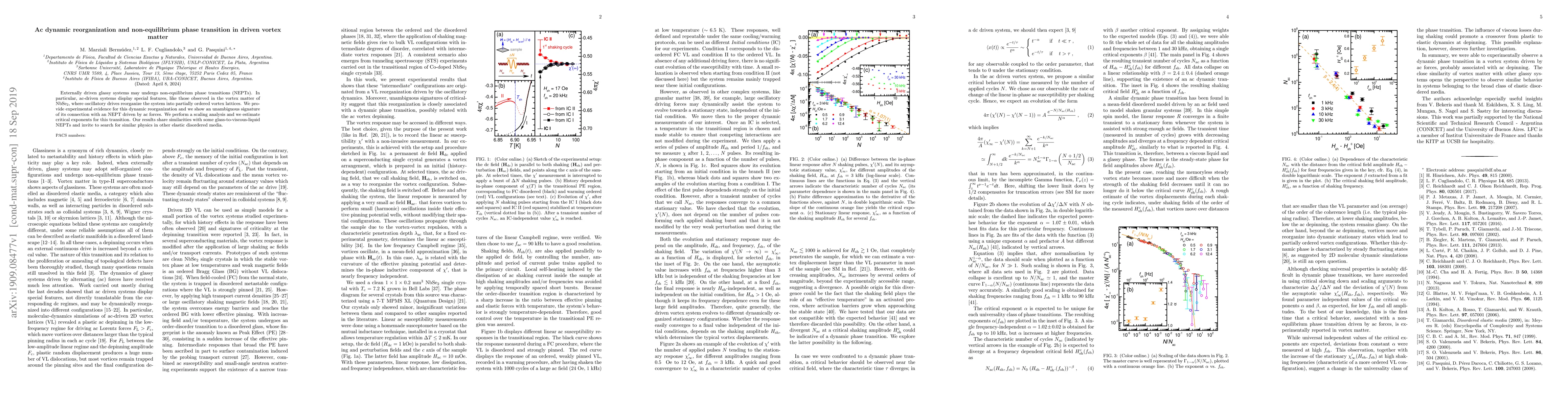 Externally driven glassy systems may undergo non-equilibrium phase transitions (NEPTs). In particular, ac-driven systems display special features, like those observed in the vortex matter of $\mathrm{NbSe_2}$, where oscillatory drives reorganize the system into partially ordered vortex lattices. We provide experimental evidence for this dynamic reorganization and we show an unambiguous signature of its connection with an NEPT driven by ac forces. We perform a scaling analysis and we estimate critical exponents for this transition. Our results share similarities with some glass-to-viscous-liquid NEPTs and invite to search for similar physics in other elastic disordered media.