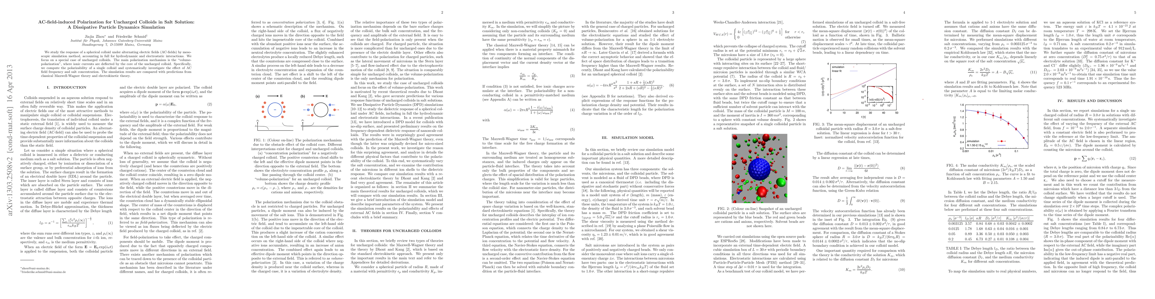 This paper uses Dissipative Particle Dynamics simulations to study the AC-field-induced polarization in uncharged colloids in salt solutions, focusing on volume-polarization due to ionic current deflection. The research investigates the effects of AC field frequency and salt concentration on colloid polarizability, comparing simulation results with classical theories.