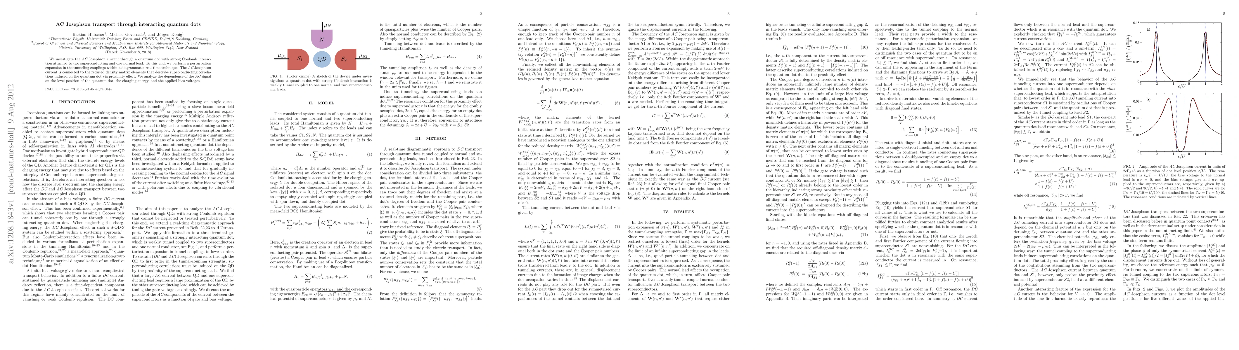 We investigate the AC Josephson current through a quantum dot with strong Coulomb interaction attached to two superconducting and one normal lead. To this end, we perform a perturbation expansion in the tunneling couplings within a diagrammatic real-time technique. The AC Josephson current is connected to the reduced density matrix elements that describe superconducting correlations induced on the quantum dot via proximity effect. We analyze the dependence of the AC signal on the level position of the quantum dot, the charging energy, and the applied bias voltages.