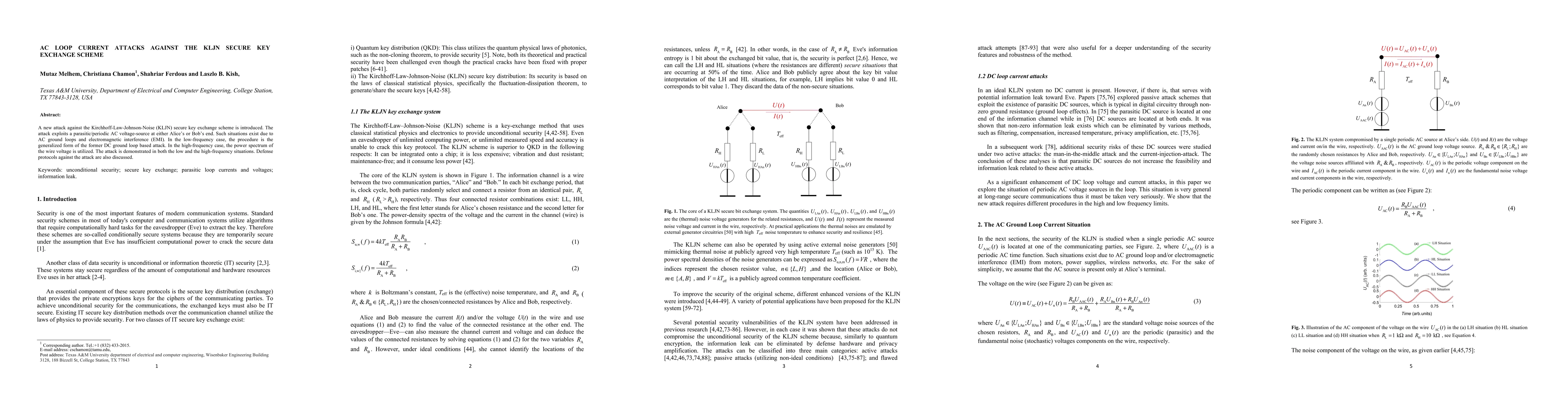 This paper introduces a new AC loop current attack against the KLJN secure key exchange scheme, exploiting parasitic AC voltage sources due to AC ground loops or electromagnetic interference. Defense protocols are proposed to mitigate these attacks in both low and high-frequency scenarios.