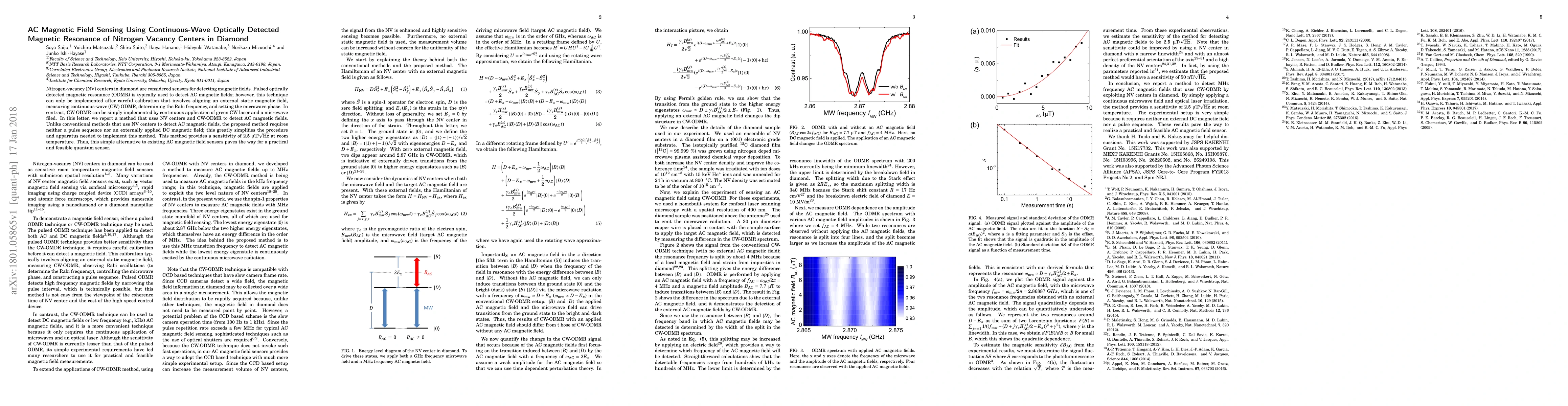 This paper proposes a novel method for detecting AC magnetic fields using continuous-wave optically detected magnetic resonance (CW-ODMR) of nitrogen-vacancy centers in diamond, eliminating the need for pulse sequences or external DC magnetic fields, thus simplifying the sensor setup and achieving a sensitivity of 2.5 μT/Hz¹⁄².