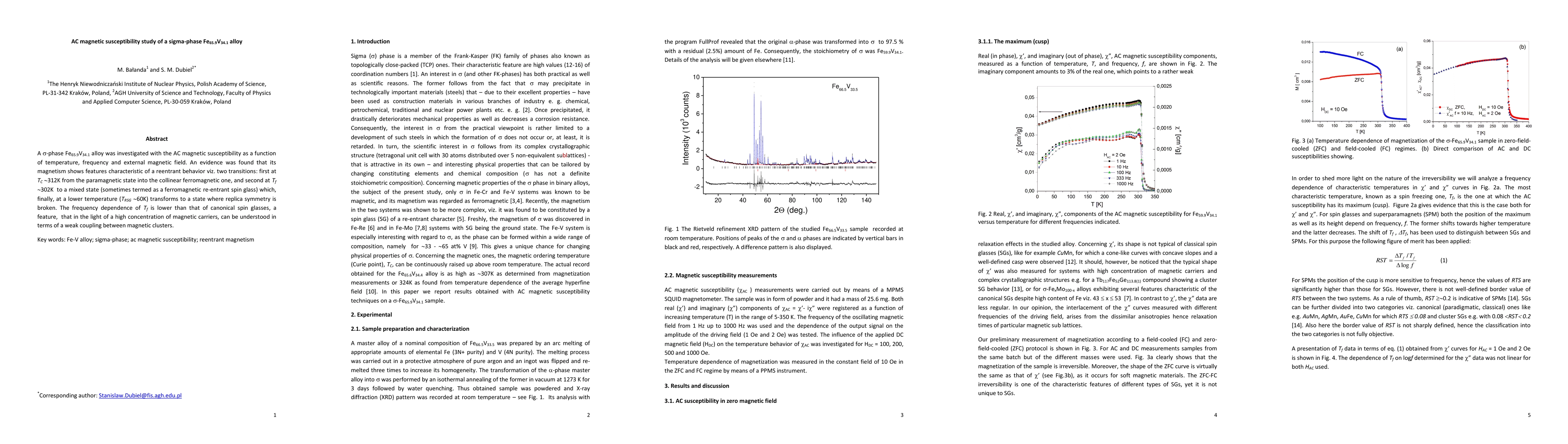 A sigma-phase Fe65.9V34.1 alloy was investigated with the AC magnetic susceptibility as a function of temperature, frequency and external magnetic field. An evidence was found that its magnetism shows features characteristic of a reentrant behavior viz. two transitions: first at TC ca.312K from the paramagnetic state into the collinear ferromagnetic one, and second at Tf ca.302K to a mixed state (sometimes termed as a ferromagnetic re-entrant spin glass) which, finally, at a lower temperature (TRSG ca.60K) transforms to a state where replica symmetry is broken. The frequency dependence of Tf is lower than that of canonical spin glasses, a feature, that in the light of a high concentration of magnetic carriers, can be understood in terms of a weak coupling between magnetic clusters.