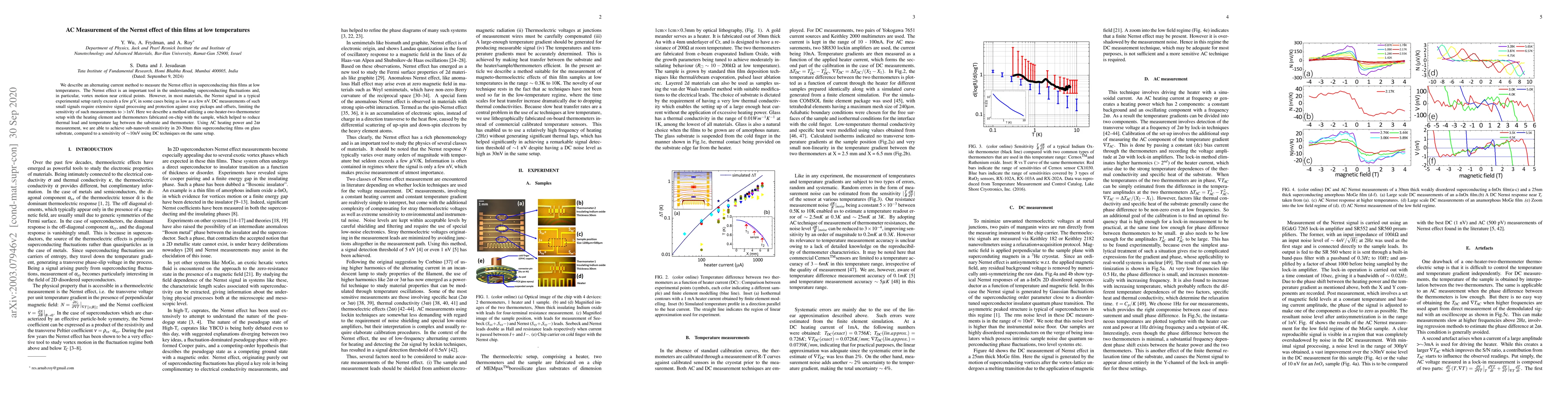 This paper presents an AC measurement technique for detecting the Nernst effect in superconducting thin films at low temperatures, achieving sub-nanovolt sensitivity. The method uses a one-heater-two-thermometer setup to minimize thermal load and improve measurement accuracy, significantly outperforming DC measurement techniques.