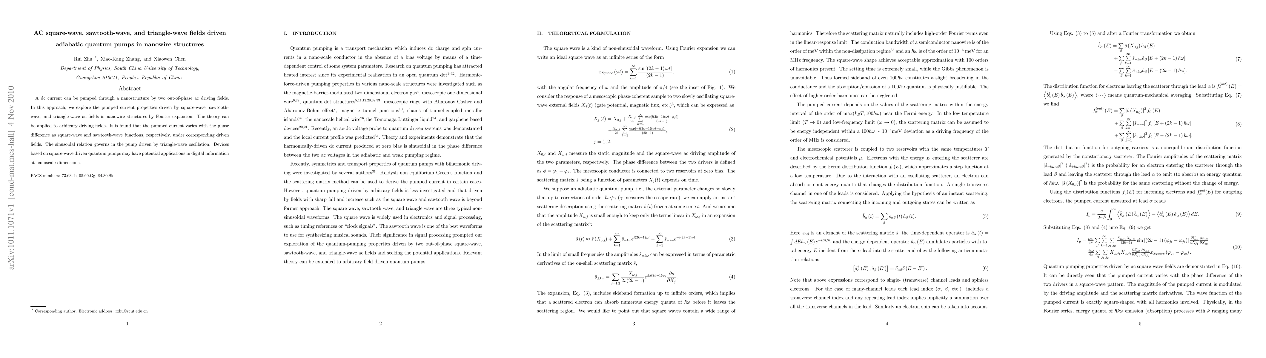 This paper investigates dc current pumping in nanowire structures driven by square-wave, sawtooth-wave, and triangle-wave ac fields, revealing distinct current-phase relationships for each wave type. Potential applications include digital information processing at nanoscale dimensions using square-wave driven quantum pumps.