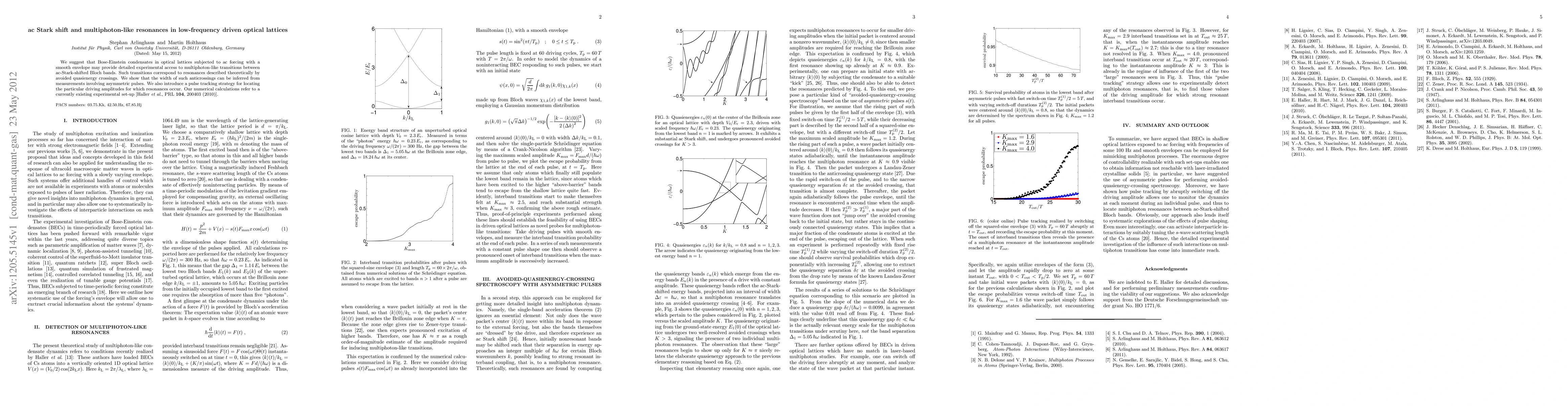 We suggest that Bose-Einstein condensates in optical lattices subjected to ac forcing with a smooth envelope may provide detailed experimental access to multiphoton-like transitions between ac-Stark-shifted Bloch bands. Such transitions correspond to resonances described theoretically by avoided quasienergy crossings. We show that the width of such anticrossings can be inferred from measurements involving asymmetric pulses. We also introduce a pulse tracking strategy for locating the particular driving amplitudes for which resonances occur. Our numerical calculations refer to a currently existing experimental set-up [Haller et al., PRL 104, 200403 (2010)].