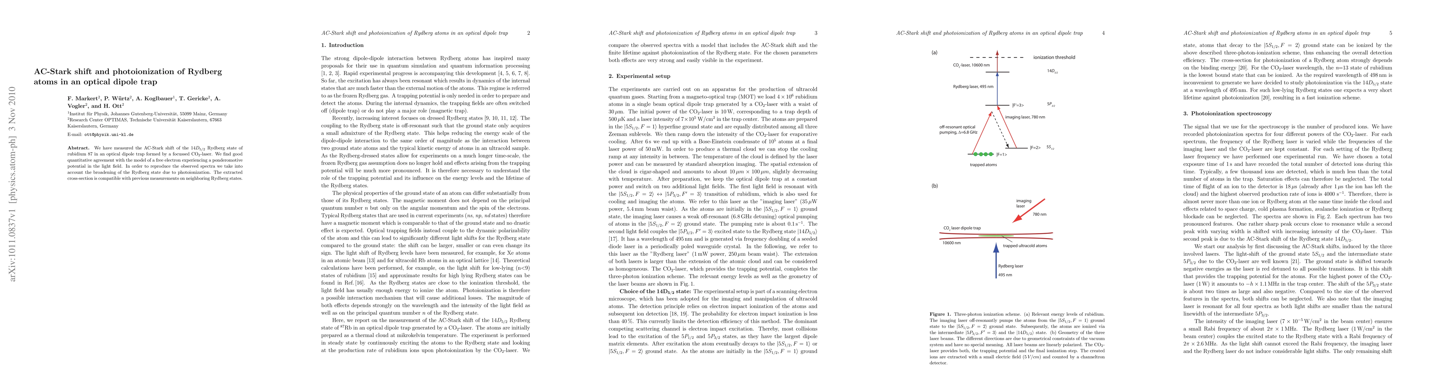 This study measures the AC-Stark shift of rubidium 87's $14D_{5/2}$ Rydberg state in an optical dipole trap, finding agreement with a free electron model in a ponderomotive potential. The observed spectra are reproduced by accounting for Rydberg state broadening due to photoionization, with the extracted cross-section matching previous measurements.
