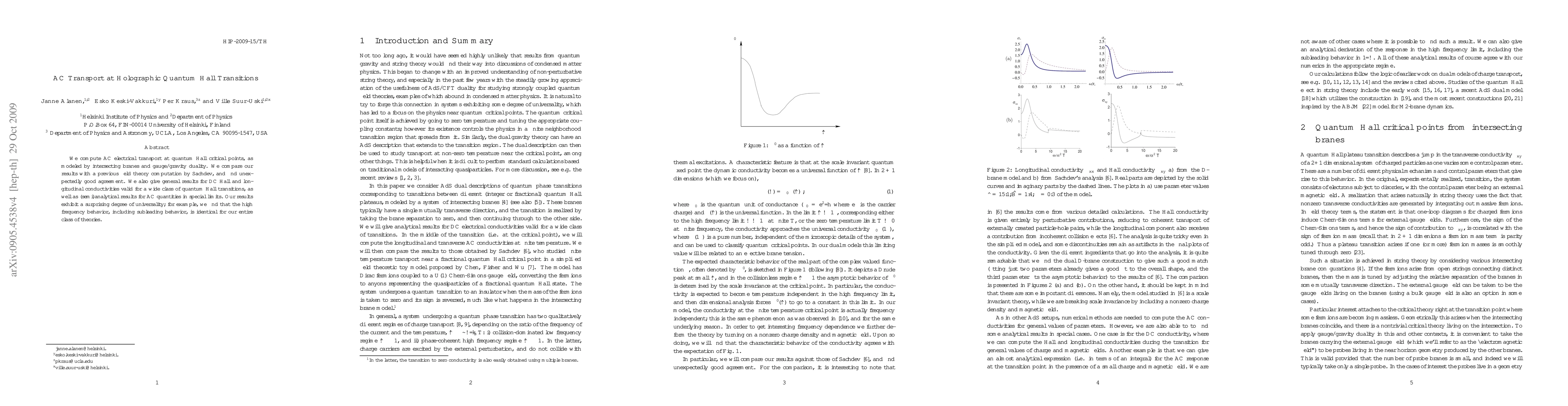 This paper investigates AC electrical transport at quantum Hall critical points using intersecting branes and gauge/gravity duality, finding unexpectedly good agreement with previous field theory results. It also presents general DC conductivities and (semi)analytical AC results for specific limits, revealing a surprising degree of universality in high-frequency behavior across various theories.