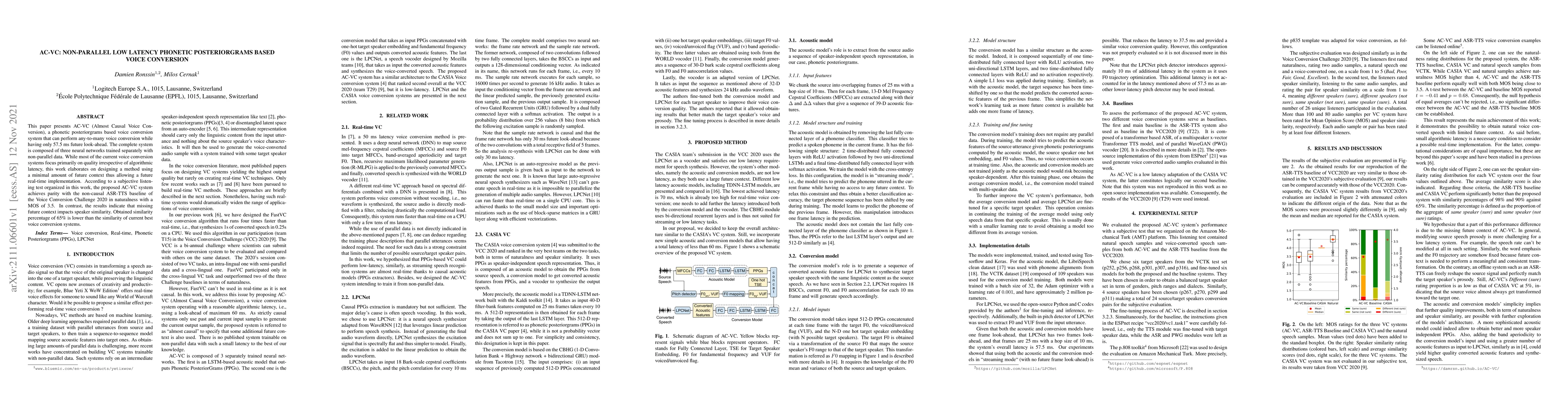 This paper introduces AC-VC, a low-latency voice conversion system using phonetic posteriorgrams with minimal future context, achieving near-real-time performance. Despite a slight drop in speaker similarity, the system matches non-causal baselines in naturalness.