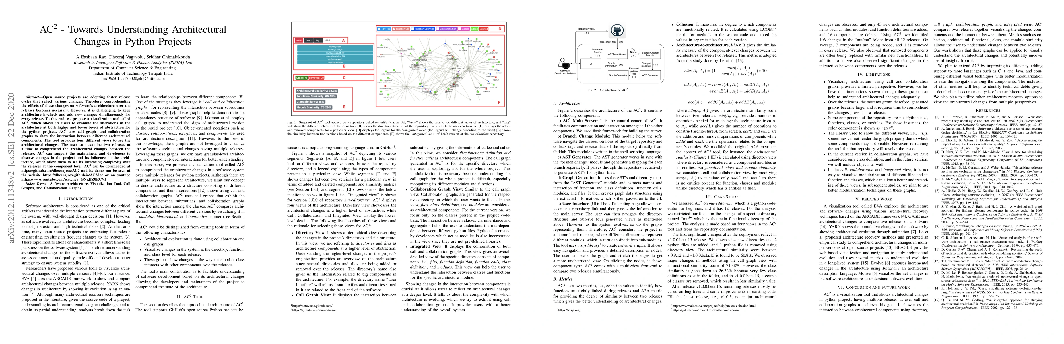 The paper introduces AC2, a visualization tool for examining architectural changes in Python projects undergoing rapid releases. AC2 uses call and collaboration graphs to provide four views for comparing architectural alterations between two releases, aiding developers in understanding complexity and changes over time.