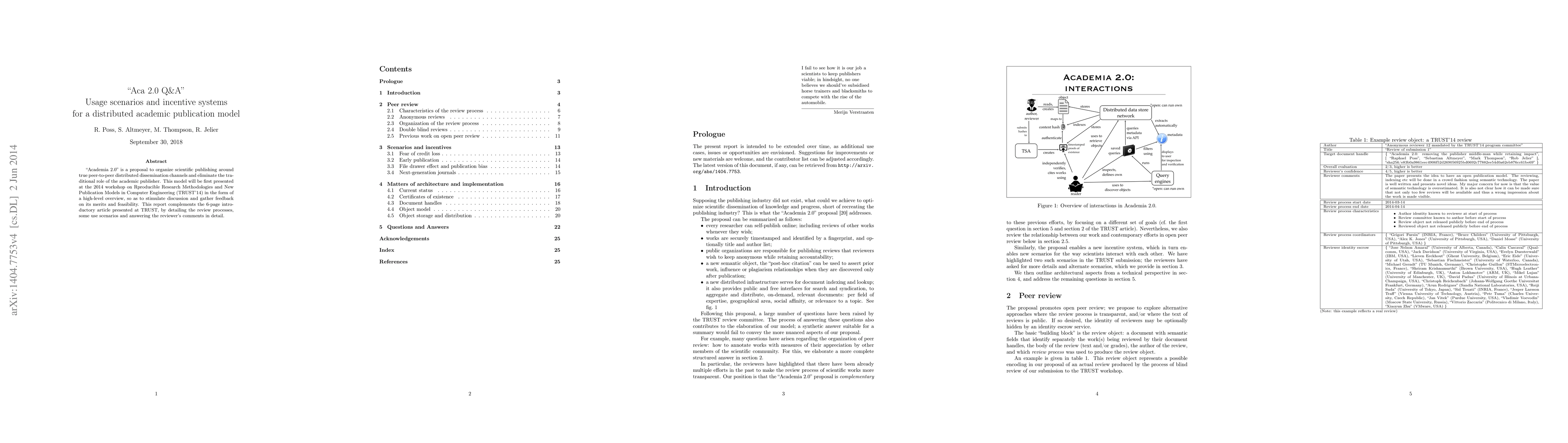"Academia 2.0" is a proposal to organize scientific publishing around true peer-to-peer distributed dissemination channels and eliminate the traditional role of the academic publisher. This model will be first presented at the 2014 workshop on Reproducible Research Methodologies and New Publication Models in Computer Engineering (TRUST'14) in the form of a high-level overview, so as to stimulate discussion and gather feedback on its merits and feasibility. This report complements the 6-page introductory article presented at TRUST, by detailing the review processes, some use scenarios and answering the reviewer's comments in detail.