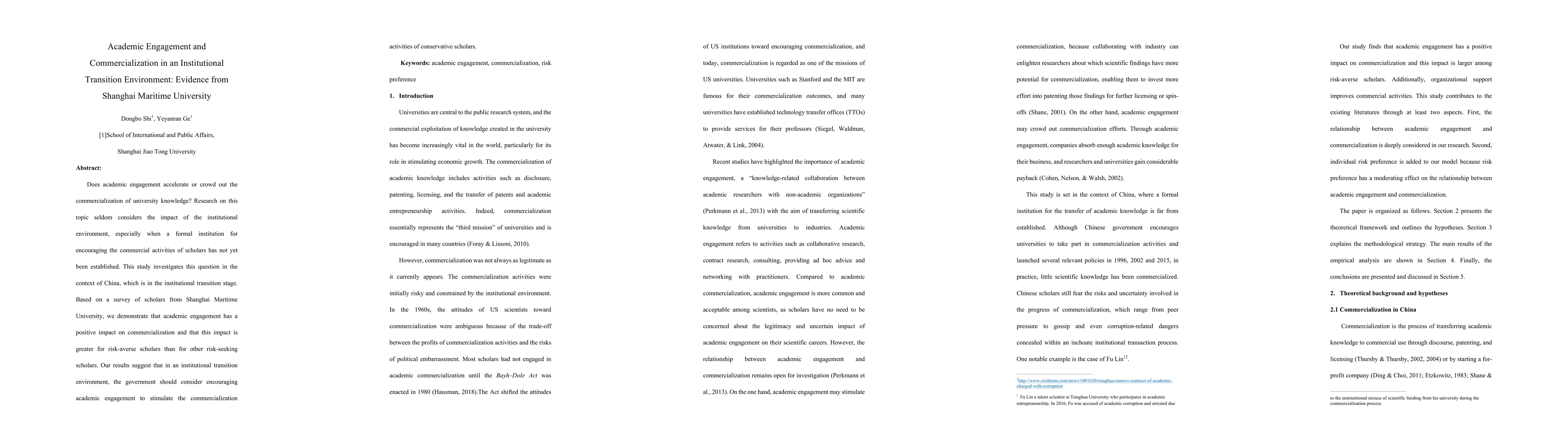 This study examines the relationship between academic engagement and commercialization at Shanghai Maritime University during China's institutional transition. Findings indicate that academic engagement positively influences commercialization, with a stronger effect on risk-averse scholars, suggesting that government support should focus on encouraging such engagement to boost conservative scholars' commercial activities.