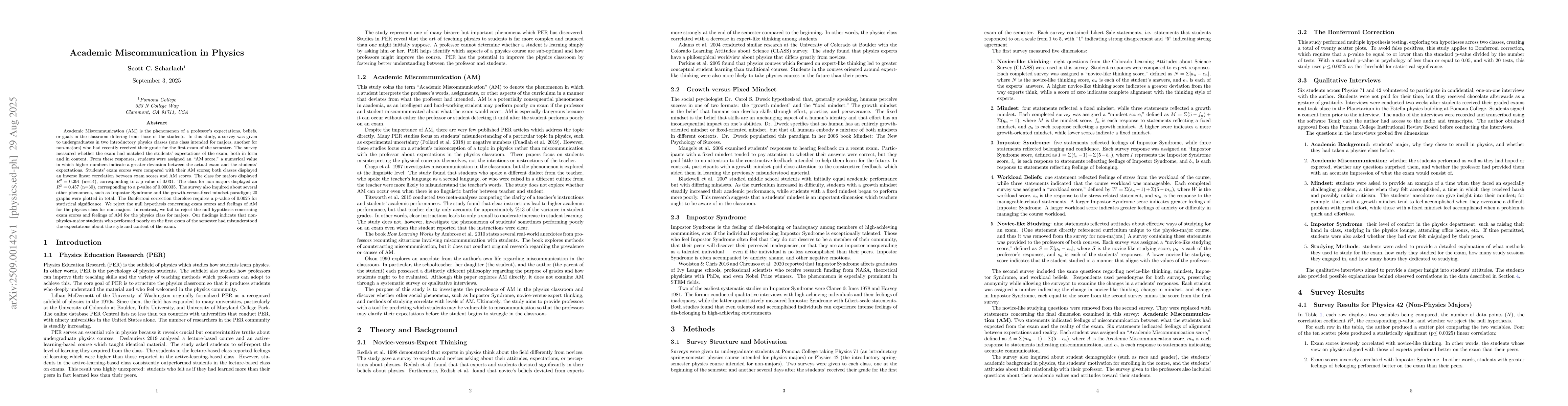 Academic Miscommunication (AM) is the phenomenon of a professor's expectations, beliefs, or goals in the classroom differing from those of the students. In this study, a survey was given to undergraduates in two introductory physics classes (one class intended for majors, another for non-majors) who had recently received their grade for the first exam of the semester. The survey measured whether the exam had matched the students' expectations of the exam, both in form and in content. From these responses, students were assigned an "AM score," a numerical value in which higher numbers indicate a greater deviation between the actual exam and the students' expectations. Students' exam scores were compared with their AM scores; both classes displayed an inverse linear correlation between exam scores and AM scores. The class for majors displayed R-squared = 0.291 (n=14), corresponding to a p-value of 0.031. The class for non-majors displayed an R-squared = 0.457 (n=30), corresponding to a p-value of 0.000035. The survey also inquired about several other phenomena, such as Impostor Syndrome and the growth-versus-fixed mindset paradigm; 20 graphs were plotted in total. The Bonferroni correction therefore requires a p-value of 0.0025 for statistical significance. We reject the null hypothesis concerning exam scores and feelings of AM for the physics class for non-majors. In contrast, we fail to reject the null hypothesis concerning exam scores and feelings of AM for the physics class for majors. Our findings indicate that non-physics-major students who performed poorly on the first exam of the semester had misunderstood the expectations about the style and content of the exam.