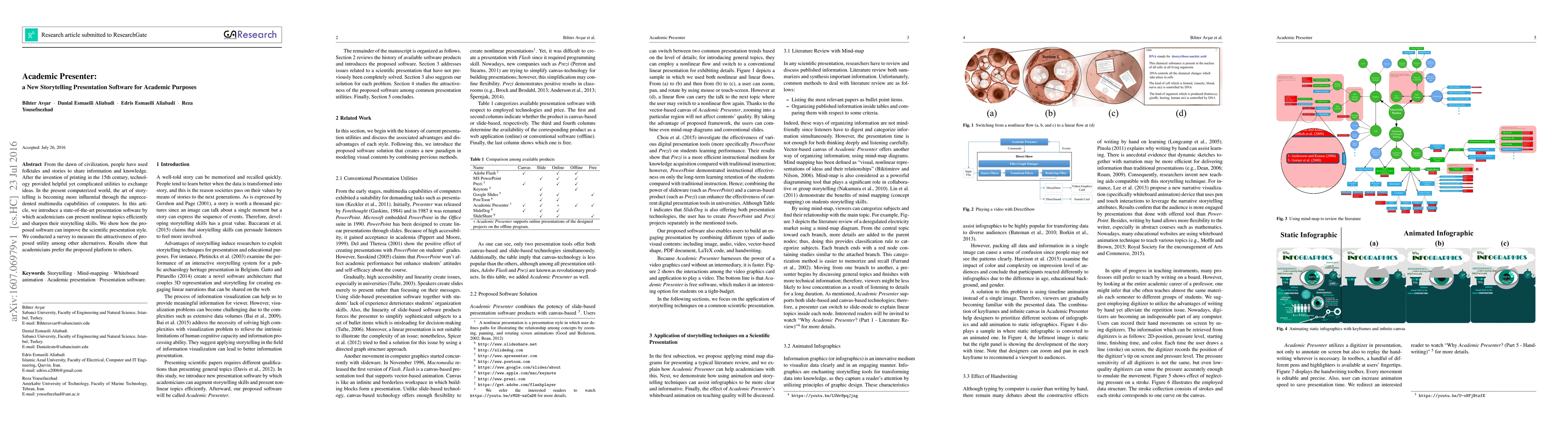 From the dawn of civilization, people have used folktales and stories to share information and knowledge. After the invention of printing in the 15th century, technology provided helpful yet complicated utilities to exchange ideas. In the present computerized world, the art of storytelling is becoming more influential through the unprecedented multimedia capabilities of computers. In this article, we introduce a state-of-the-art presentation software by which academicians can present nonlinear topics efficiently and sharpen their storytelling skills. We show how the proposed software can improve the scientific presentation style. We conducted a survey to measure the attractiveness of proposed utility among other alternatives. Results show that academicians prefer the proposed platform to others.