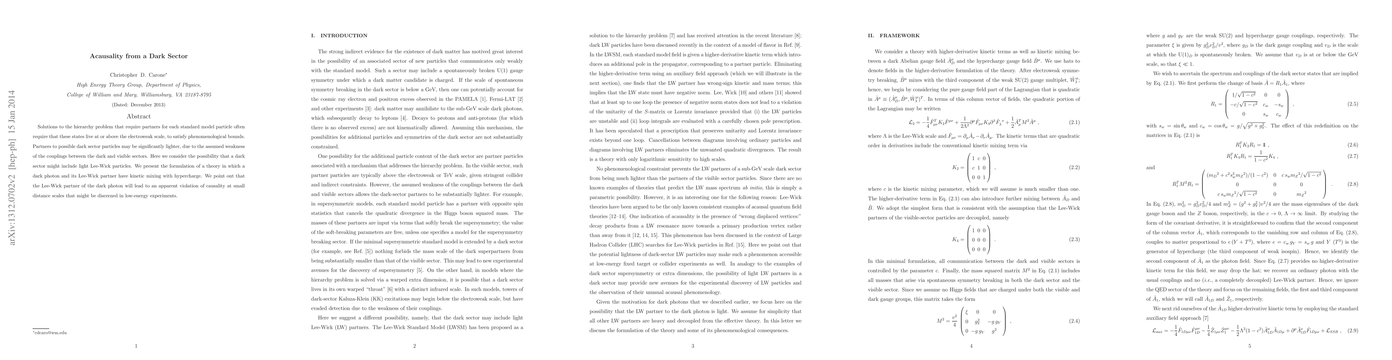 Solutions to the hierarchy problem that require partners for each standard model particle often require that these states live at or above the electroweak scale, to satisfy phenomenological bounds. Partners to possible dark sector particles may be significantly lighter, due to the assumed weakness of the couplings between the dark and visible sectors. Here we consider the possibility that a dark sector might include light Lee-Wick particles. We present the formulation of a theory in which a dark photon and its Lee-Wick partner have kinetic mixing with hypercharge. We point out that the Lee-Wick partner of the dark photon will lead to an apparent violation of causality at small distance scales that might be discerned in low-energy experiments.